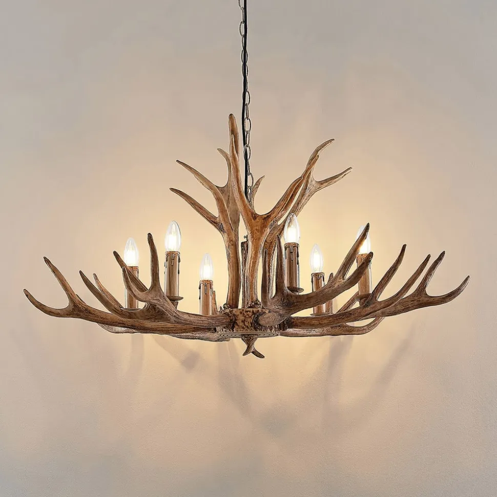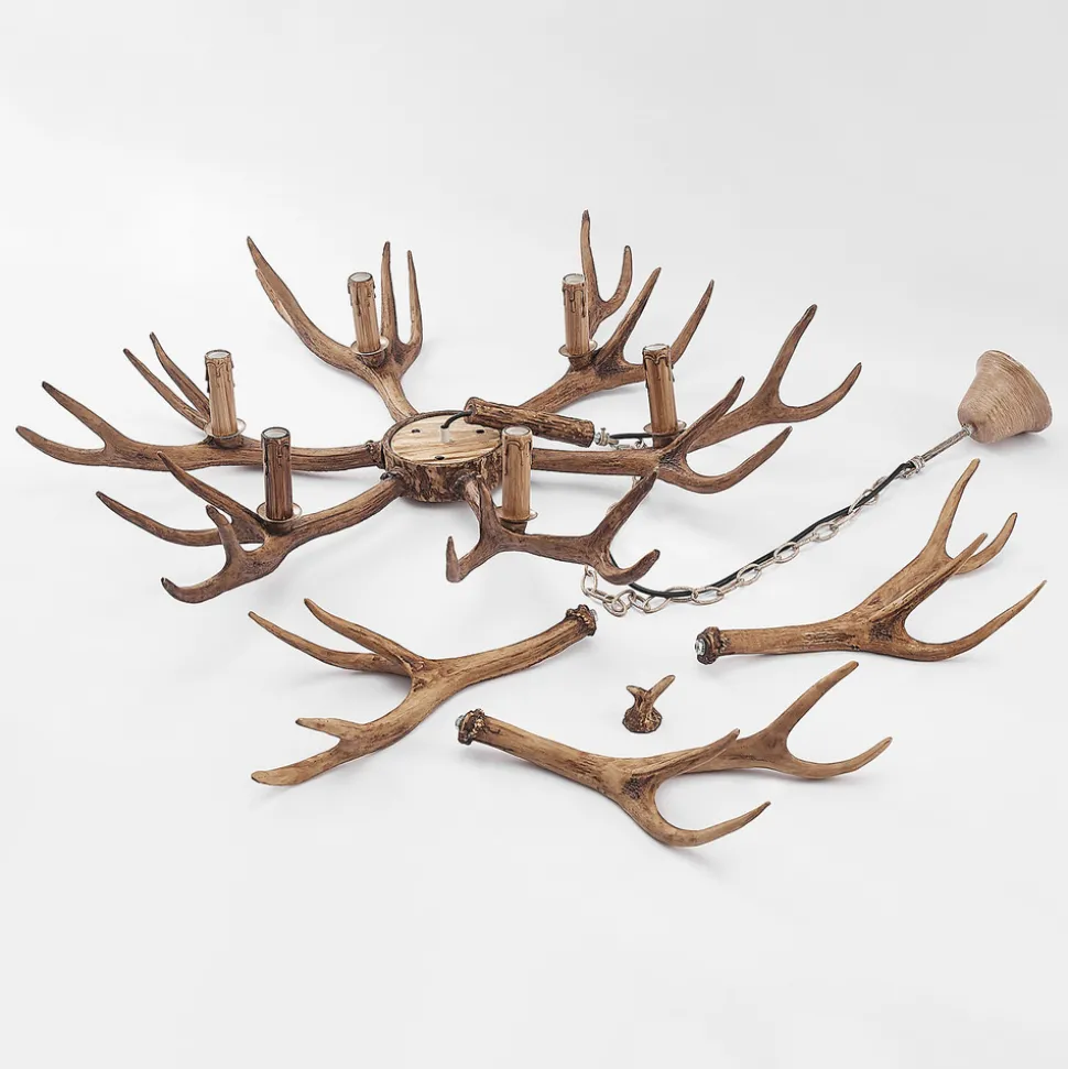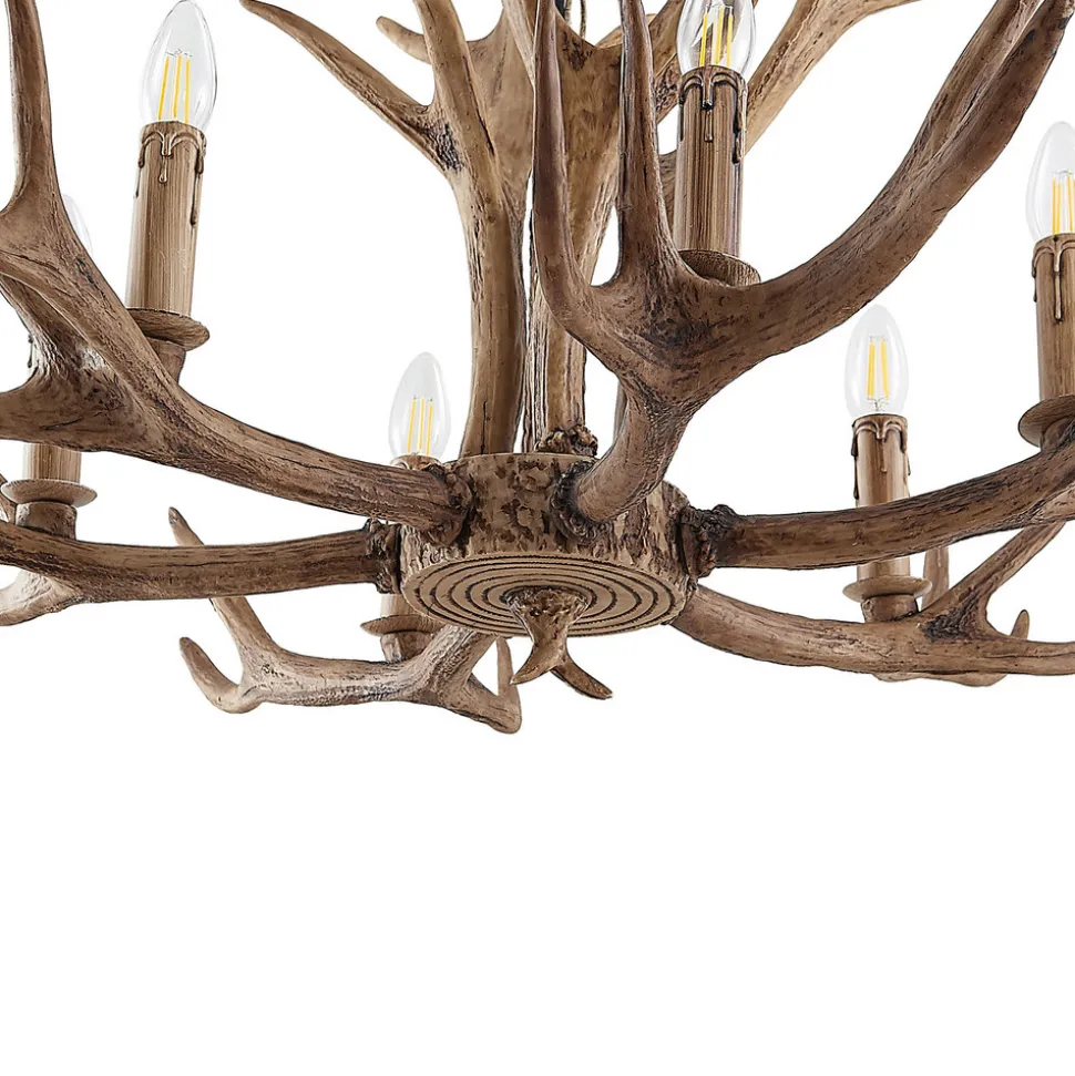 Stor Tejask lysekrone i form av gevir Tejask imponerer med sin rustikke design og er en lysekrone med kjedeoppheng som ikke bare kan brukes i private stuer og spisestuer, men som også pynter opp enhver rustikk restaurant med sitt slående og iøynefallende utseende, som utvilsomt minner om gevir og skog og eng. Dette gjør Tejask lysekrone til en lyskilde som kan tilordnes hyttestilen og vet å skape en spesiell hygge i rombelysningen. Den rustikke brune skyggen på plastgeviret ser veldig autentisk ut, og hengelampen kan utstyres med i alt seks mignonpærer, som også kan ha en ekstra varm lysfarge, slik det noen ganger er tilfelle med LED-filamentpærer. Da blir hyggen i rommet fullkommen, og du kan lene deg tilbake og slappe av i lyset fra Tejask hengelampe og føle deg vel.