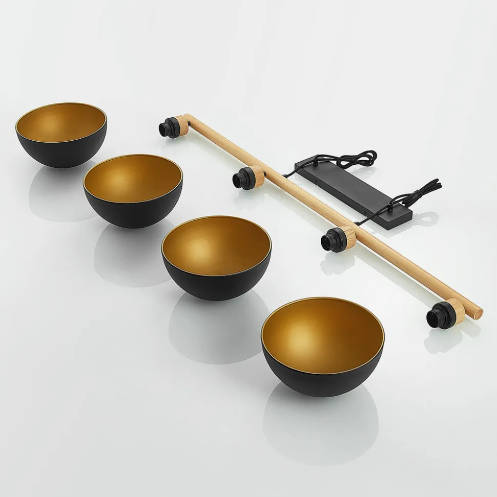 Pendellampe Tirzana med 4 lyskilder, metallskjermer i svart og gull og en dekorativ trestang Pendellampen Tirzana i bjelkeform er ideell til spisebordet, der alt lyset rettes nedover og blending unngås fordi de svarte lampeskjermene i jern er helt ugjennomsiktige og lyset derfor bare sendes nedover på bord- eller benkeflaten. Skjermene er farget gull på innsiden, noe som ikke bare skaper en severdig fargekontrast, men også en koselig lyseffekt fordi det skapes vakre refleksjoner. En trestang laget av treet fra gummitreet brukes til å feste de fire halvkuleformede skjermene på den ene siden og til å utfylle utseendet dekorativt på den andre. For å foredle det generelle utseendet med stil, bør det velges lamper med LED-pære-teknologi, da disse ikke bare er økonomiske i forbruk og har lang levetid, men også imiterer utseendet til klassiske glødepærer.