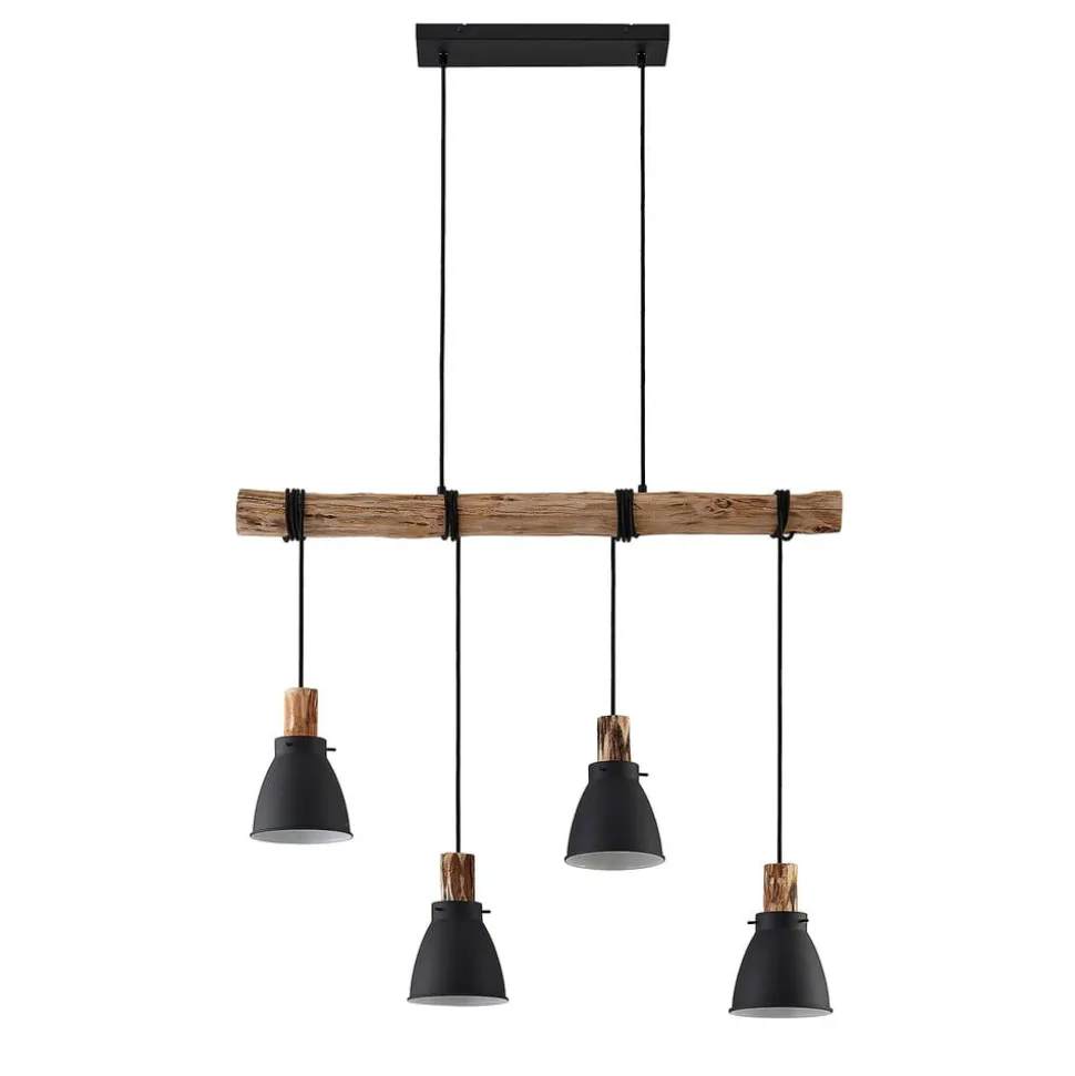 Trebale hengelampe med fire metallskjermer og treelementer Trebale hengelampe med 4 lyskilder er ideell til å belyse et bord. Den imponerer ikke bare med sin materialkombinasjon av matt svartlakkert metall og detaljer på skjermene og et oppheng av eukalyptustre, men også med sin fleksibilitet i opphengssystemet, ettersom skjermene kan vikles rundt treopphenget med kablene sine og dermed henges opp individuelt etter ønske. 4 lyskilder Trebale-pendelen kan utstyres med alle typer lyskilder, og det er også mulig å bruke langvarige og energieffektive LED-pærer. De hvite innsiden av skjermen sørger for optimal refleksjon av lyset, noe som garanterer best mulig lysutbytte. Trebale hengelampe er et naturprodukt, så det kan være forskjeller mellom produktbildet som vises her og den faktiske varen.