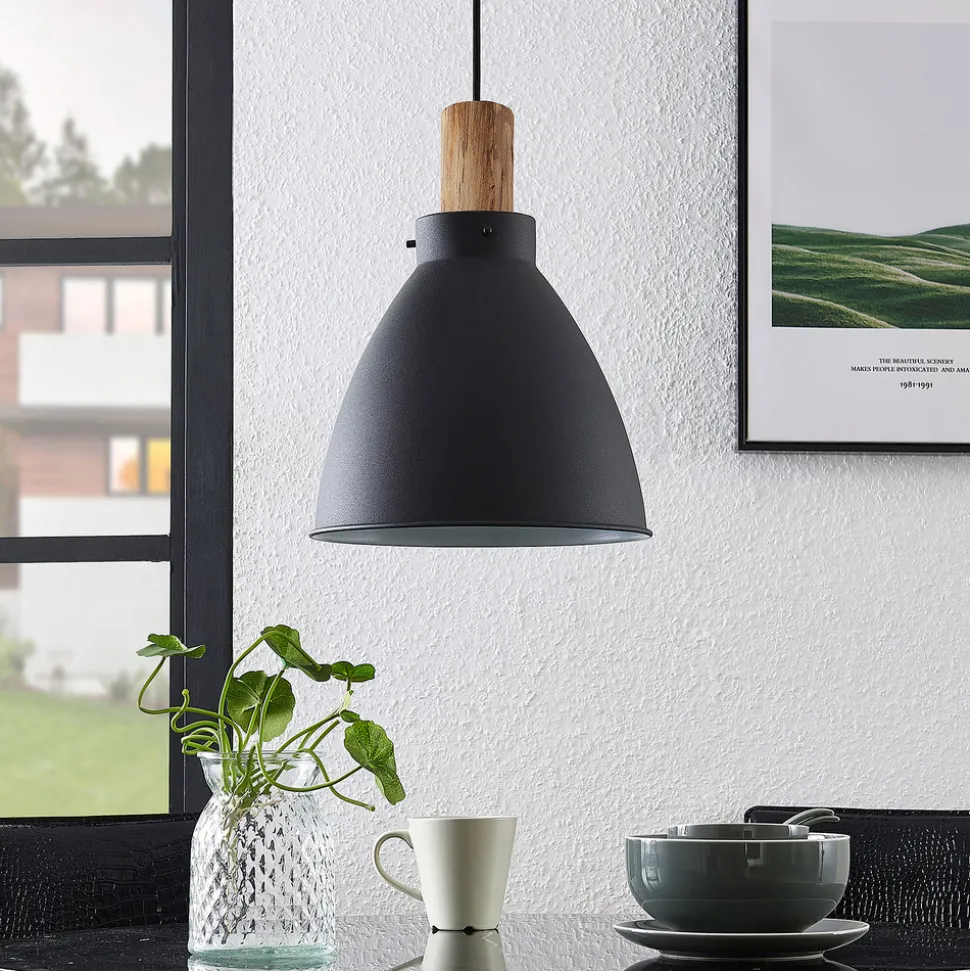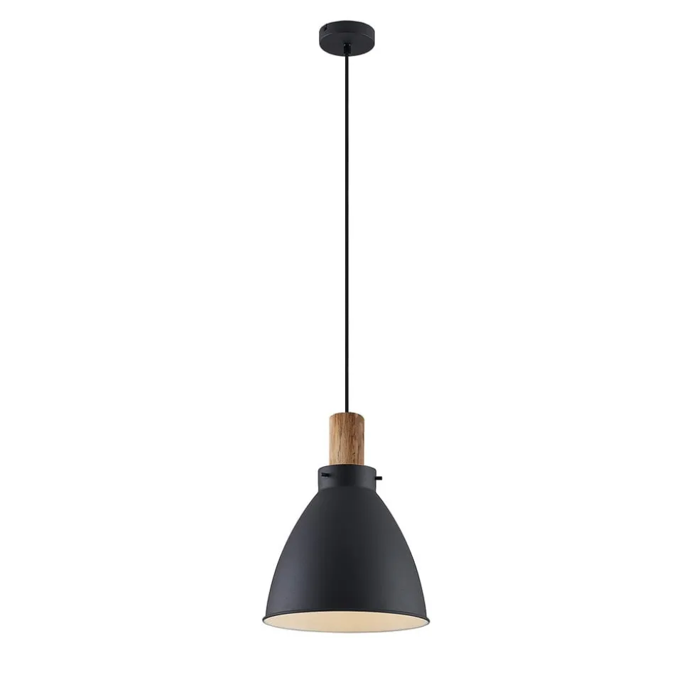 Trebale pendellampe med lampeskjerm i svart metall og tredekorasjon Lampeskjermen på Trebale hengelampe er laget av metall med en matt svart lakkfinish på utsiden og en hvit lakkfinish på innsiden for optimal lysrefleksjon. Et sylindrisk treelement av eukalyptustre fungerer som en dekorativ dekorasjon over lampeskjermen og gir en vakker kontrast til metallets matt svarte lakkfinish. Over et bord eller en benk på kjøkkenet, i spisestuen eller i stuen gir hengelampen en bred, nedadrettet lysstråle. Lampen er utstyrt med en E27-fatning, og kan for eksempel utstyres med en langvarig og energibesparende LED-pære.