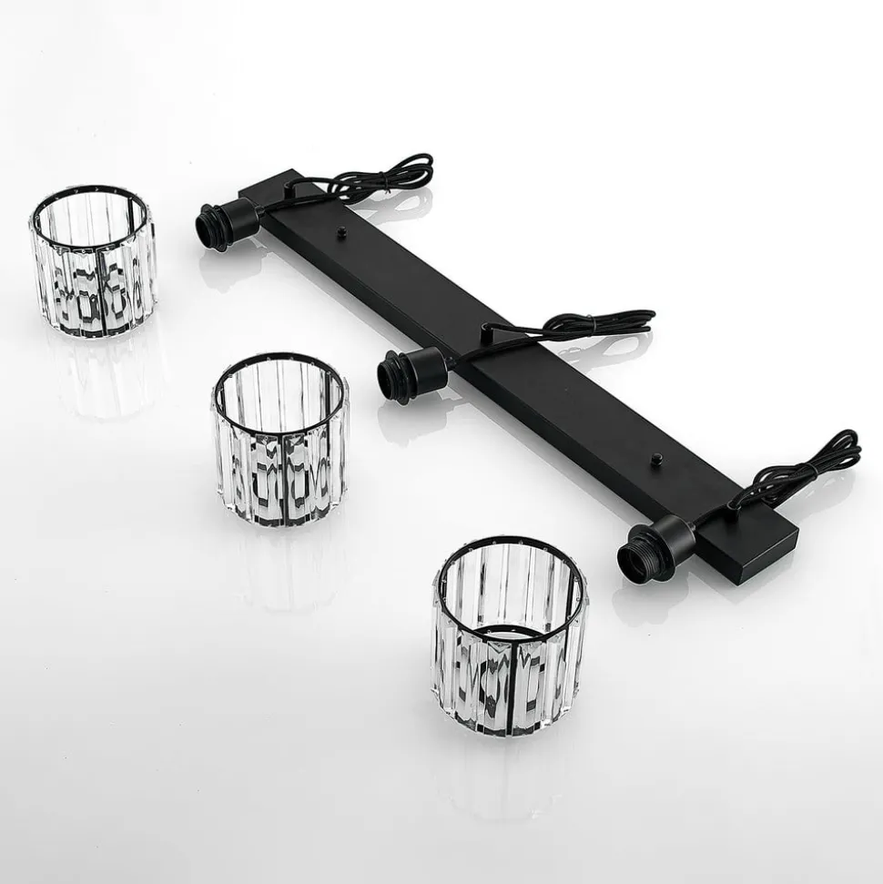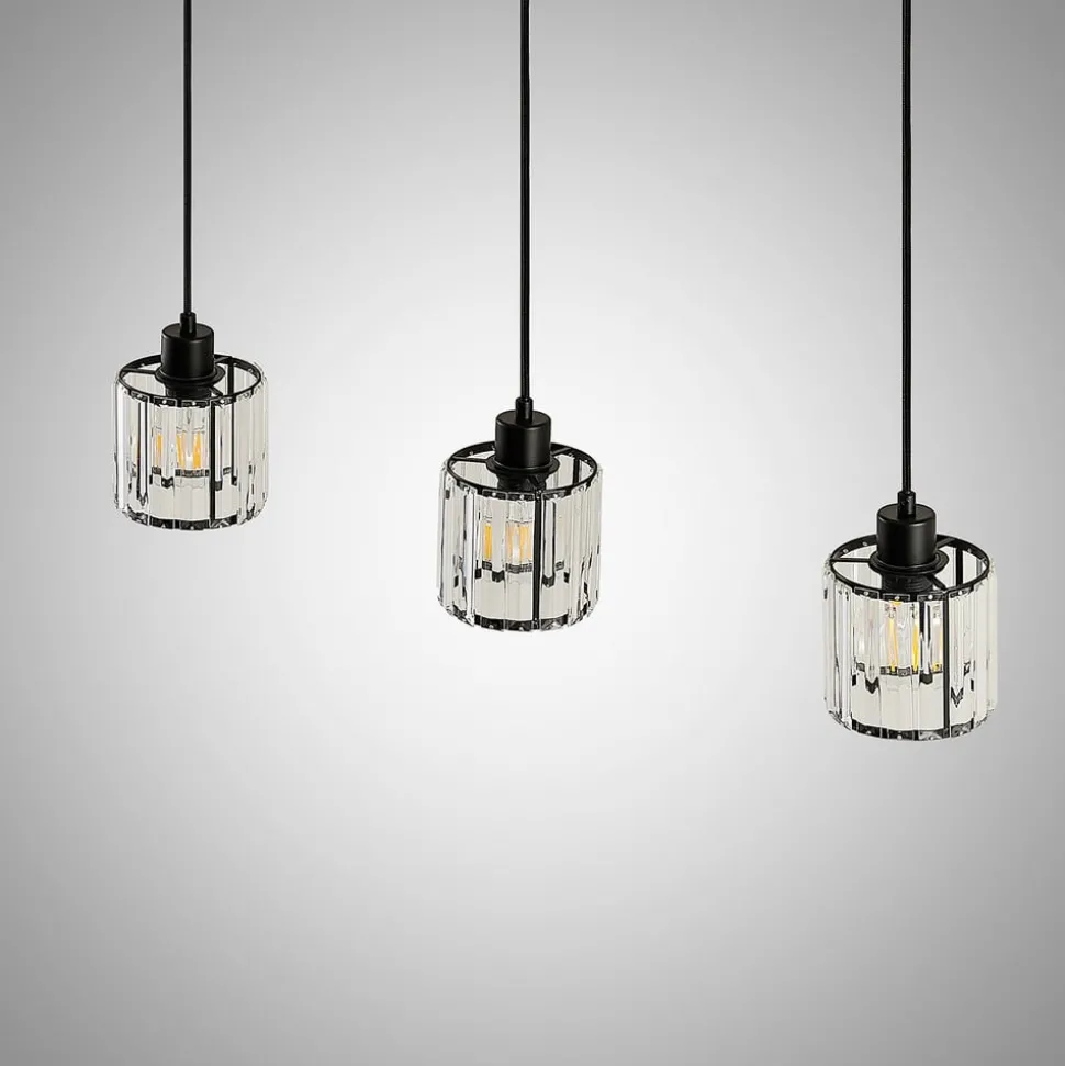 Vella hengelampe med lampeskjermer i glass Vella pendellampe har tre lampeskjermer i gjennomsiktig glass. Disse egner seg spesielt godt på steder der det er behov for sterk belysning. Glasset gjør nemlig at lyset kan slippe ut i alle retninger. Siden glasset består av flere utskårne elementer, blender lyset betrakteren mye mindre. I stedet sprer lyset seg mykt og jevnt, noe som skaper en spesielt innbydende og elegant effekt. Skjermene er festet til svarte oppheng, og en spesielt flott effekt oppnås når kablene er av ulik lengde. Dette gir lyset en dynamisk snarere enn statisk effekt.