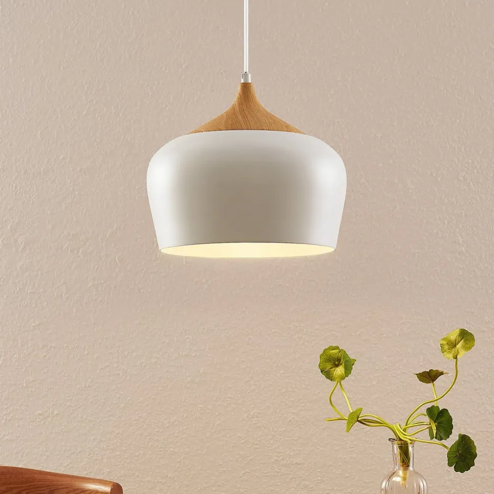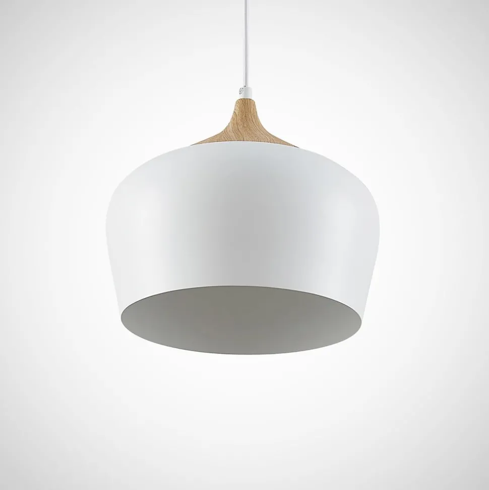Hvit metallpendel Vilsera med vakker tredetalj Skandinavisk stil flytter inn på kjøkkenet eller i spisestuen med Vilsera pendellampe. Den matte, hvite armaturen med den vakkert formede lampeskjermen har en dekorativ detalj i lyst tre i skjermens øvre del. Vilsera er en perfekt hengelampe for kjøkken eller spisestue, der den lyser opp bord eller benker med lys som skinner direkte nedover over et stort område. To eller tre armaturer kan installeres for å belyse lange disker eller spisebord.