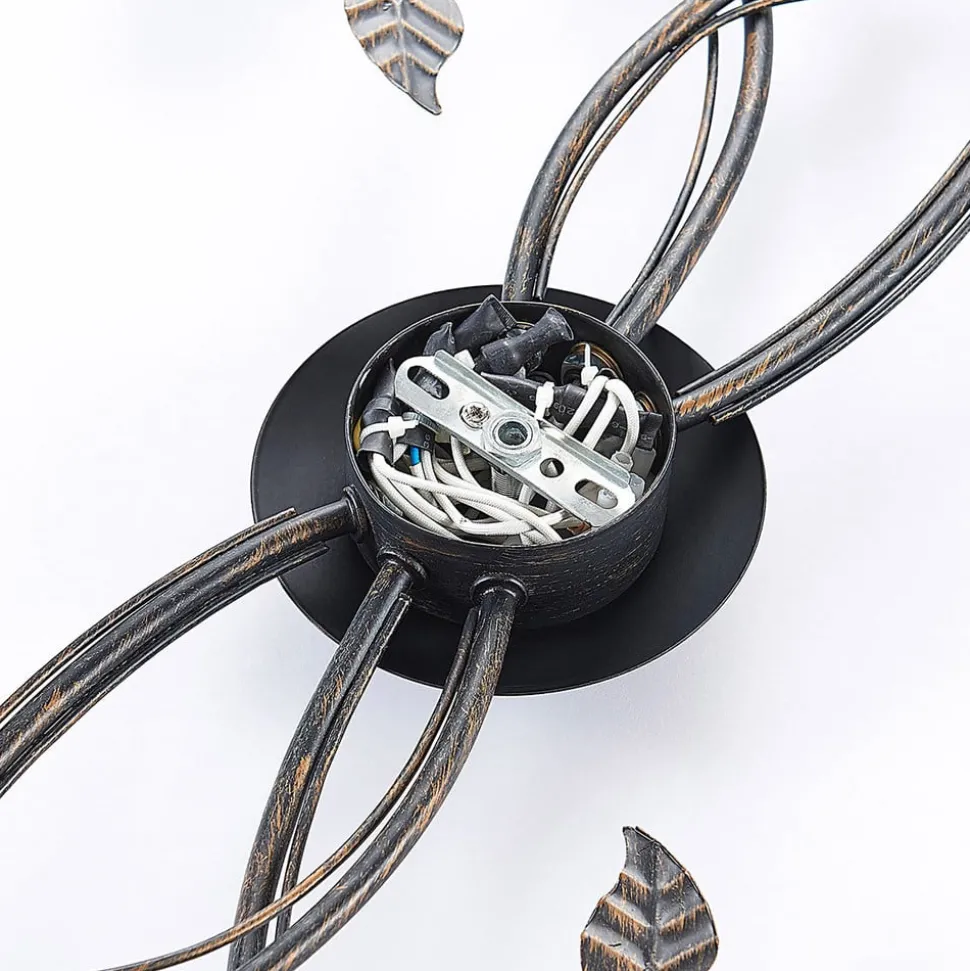 6 lyskilder Stefania taklampe med romantisk utseende Stefania er en taklampe som har et umiskjennelig romantisk utseende og gir et vakkert, jevnt lys takket være det hvite glasset. Lampearmene er romantisk buede og kompletteres av bladformede metalldekorasjoner. I tillegg har den svarte overflaten på rammen fått en finish med delikate penselstrøk i gull, noe som passer perfekt inn i det generelle designet.
