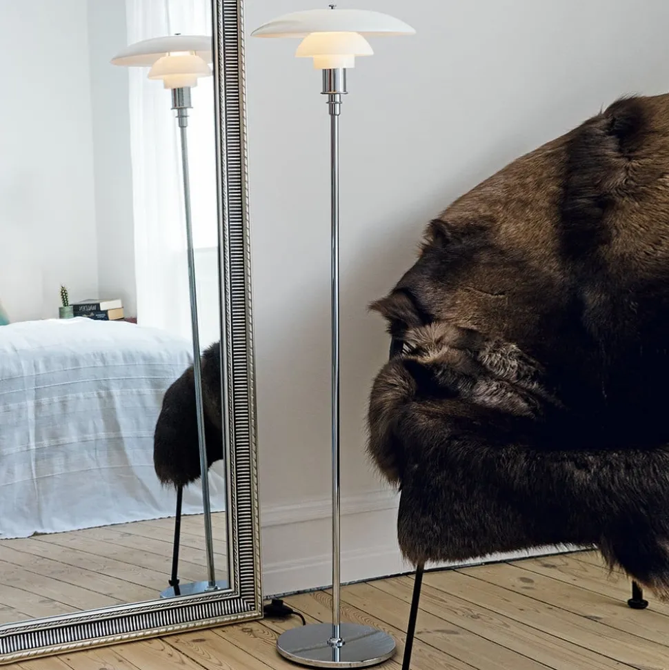 Den stilige gulvlampen PH 3 1/2-2 1/2 er en del av den danske designeren Poul Henningsens lampeserie med tre reflekterende skjermer. Han skapte dette skjermsystemet i 1925/26 og videreutviklet det til 19 modeller med ca. 1 000 variasjoner. Den tredelte skjermen sørger for at mesteparten av lyset rettes nedover.