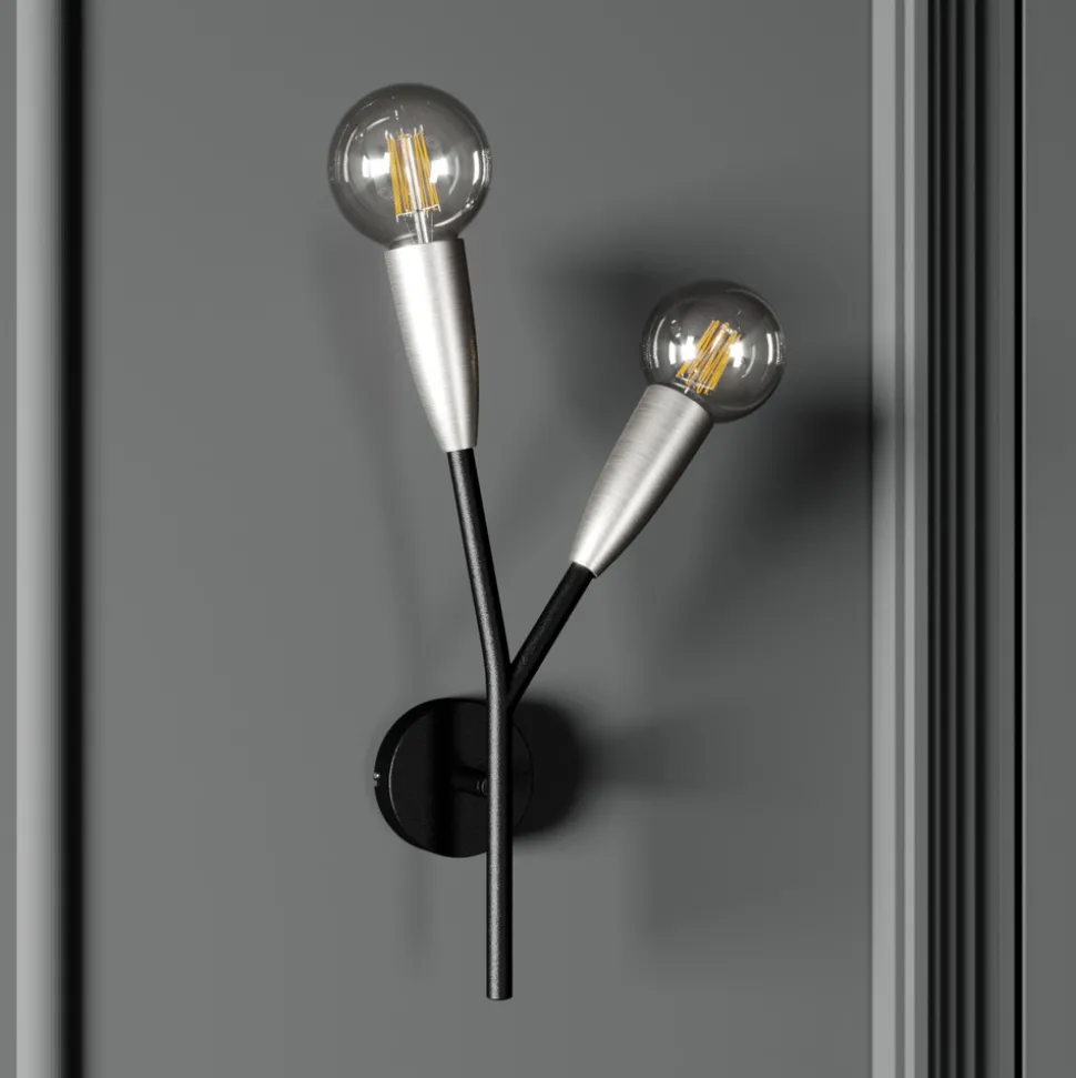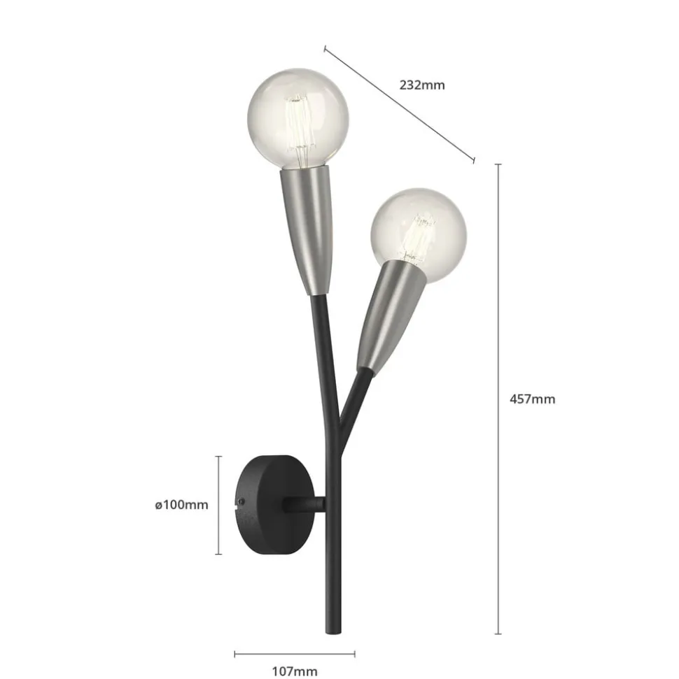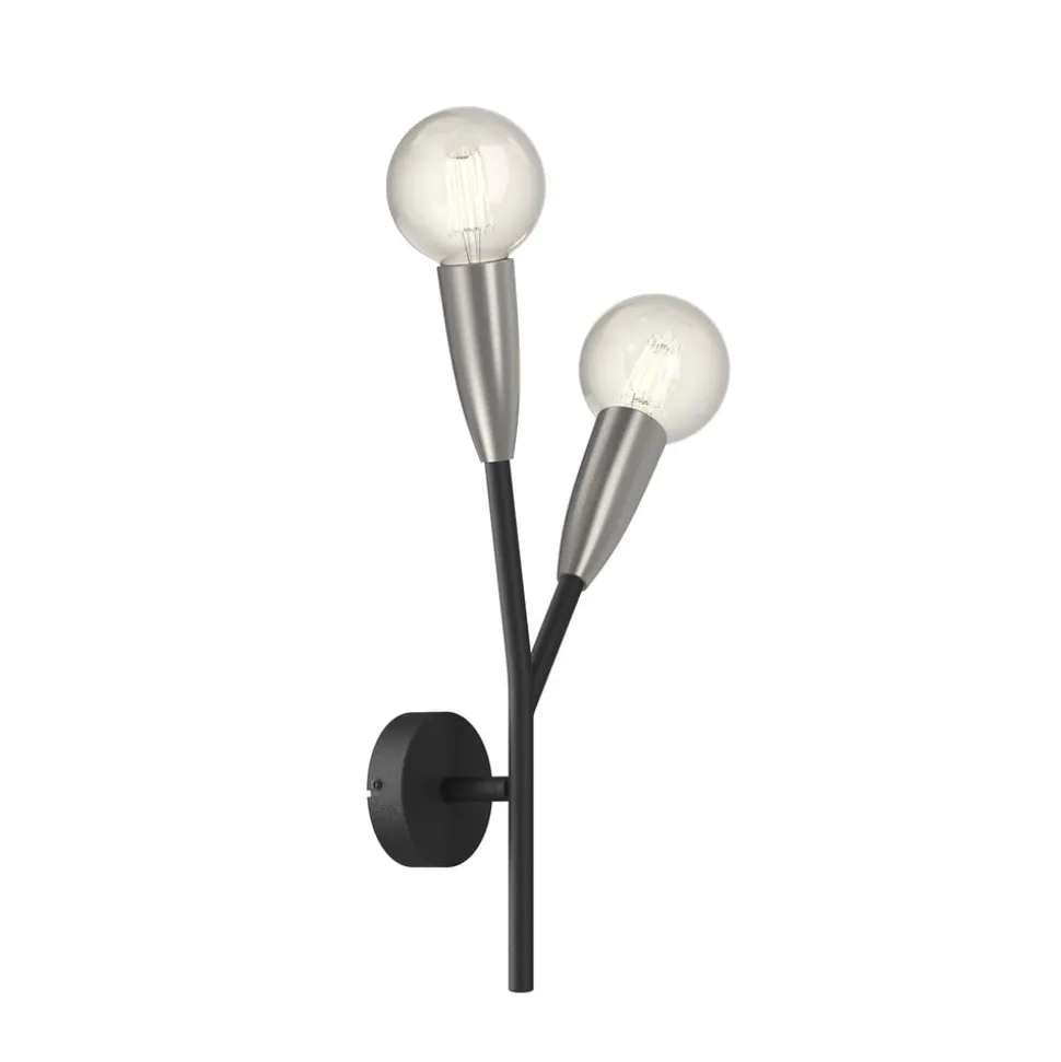 Svart vegglampe med nikkelfargede detaljer, 2 lyskilder