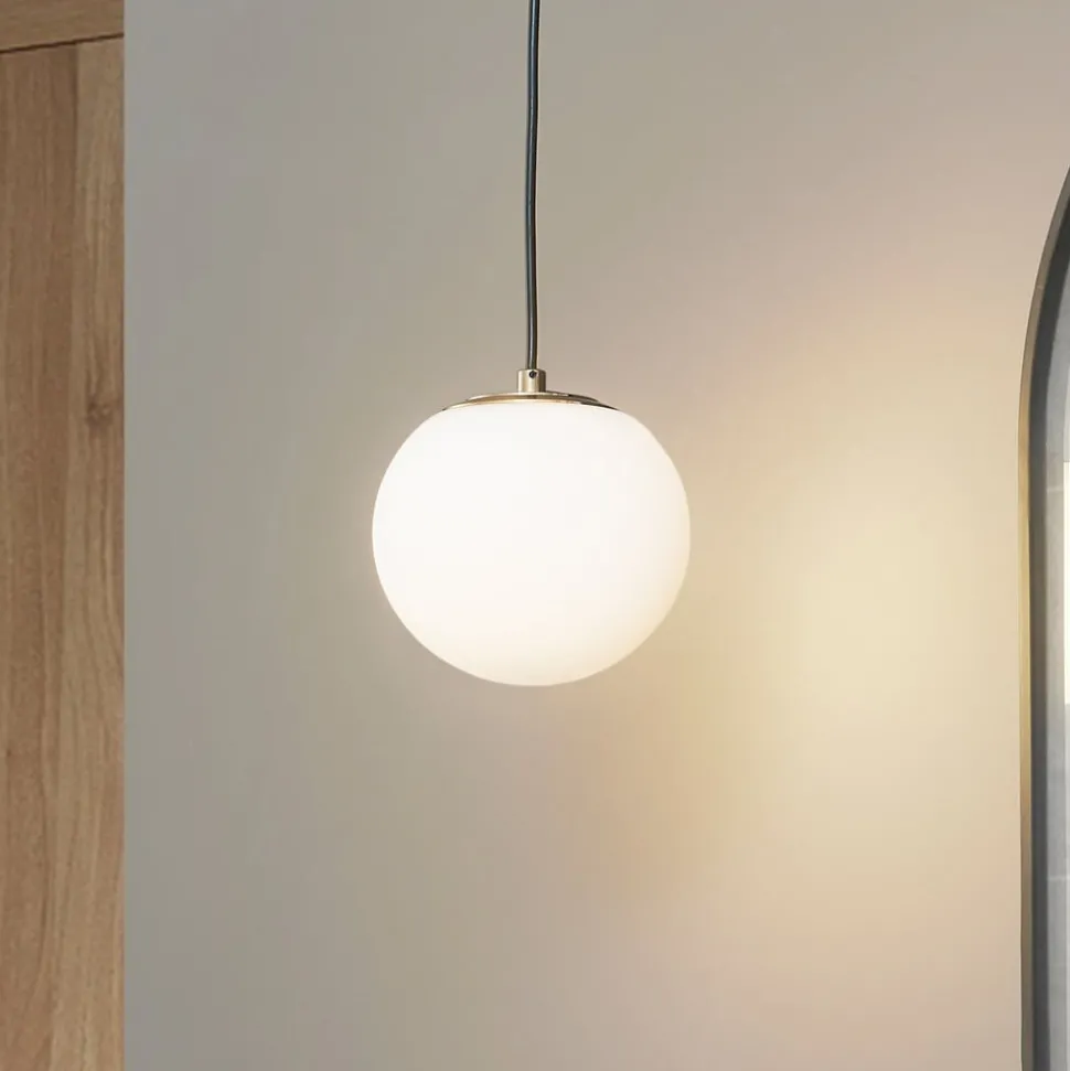 Sfærisk glasspendel Bidolo til badet Bidolo-pendellampen er et ekte blikkfang på badet – denne lampen skaper en hyggelig atmosfære. Den kan dimmes ved hjelp av en ekstern dimmer, som ikke er inkludert. Beskyttelsesgraden er tilstrekkelig for bruk på badet (IP44). Med sin tidløse design og utførelse av høy kvalitet er pendellampen en verdifull investering. La deg fortrylle av det fascinerende lyset!