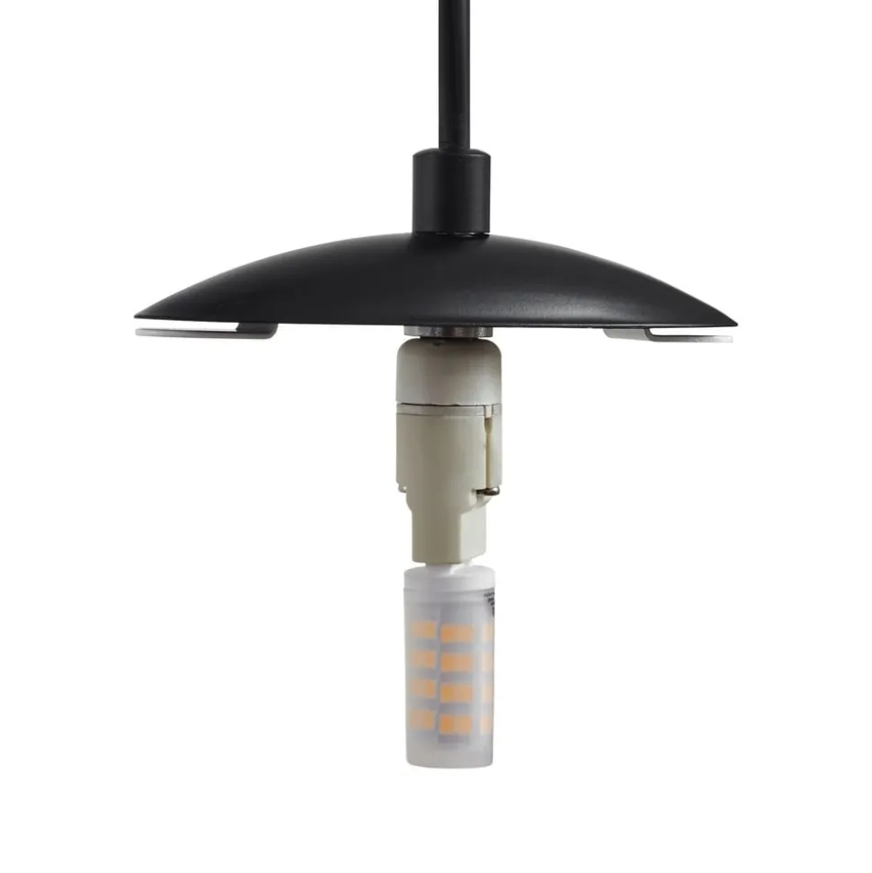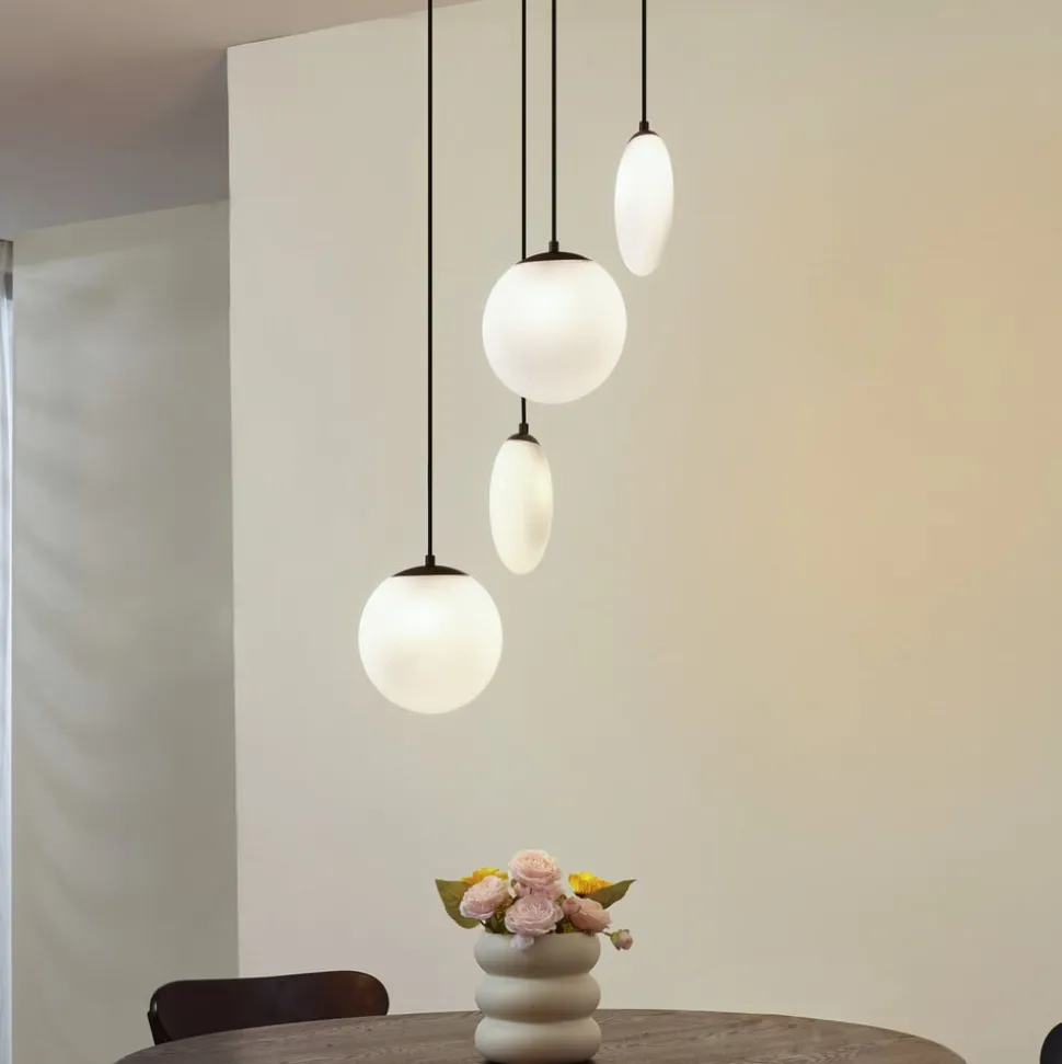 Lunelle pendellampe i 4 lyskilder med hvite skjermer i glass og baldakin i svart jern Lunelle pendellampe, designet av Markus Binz, kombinerer moderne design med funksjonell allsidighet. Lampen er laget av høykvalitetsglass og robust jern, og passer sømløst inn i moderne stue- og spisestuer. Kombinasjonen av hvit og svart finish gir armaturen en stilig estetikk som kan fungere både som et sentralt element og som et diskret tilskudd til rommet. Lunelle kan utstyres med G9-lyskilder – hvis du velger dimbare eller til og med smarte lyskilder, kan du skape en fleksibel belysning når det gjelder lysstyrke og lysfarge.