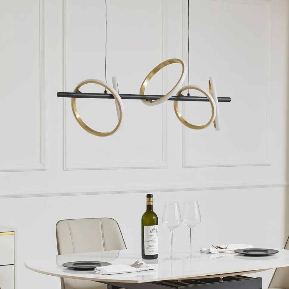 Madu LED-pendellampe med gylne lyselementer Madu LED-pendellampen med ringformede lyselementer er en moderne og energibesparende belysningsløsning for hjemmet. På en svart stang er det montert flere ringer som imponerer med sitt elegante, gylne utseende. På utsiden sitter LED-lampene under en hvit skjerm som en lysstripe og avgir et universelt hvitt lys hele veien rundt. Lyskildenes ulike plassering gir pendellampen et spennende og individuelt uttrykk, og den er spesielt attraktiv over et spisebord.