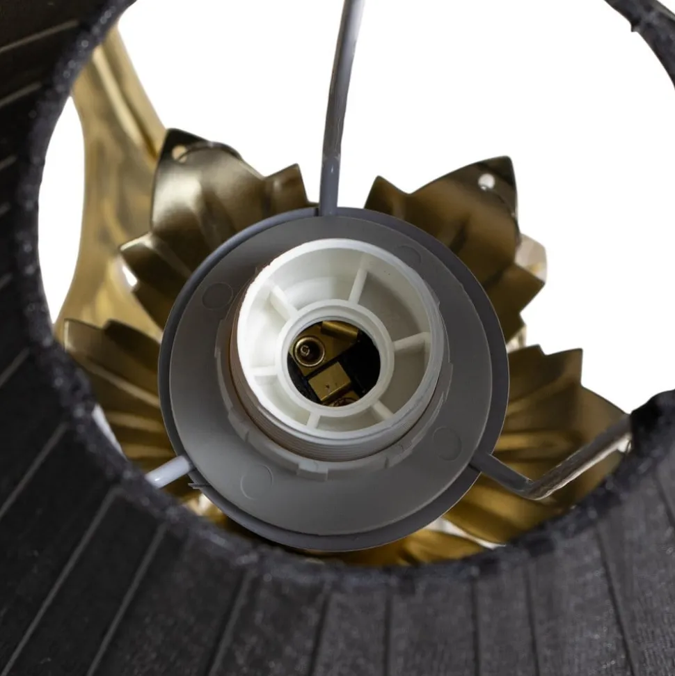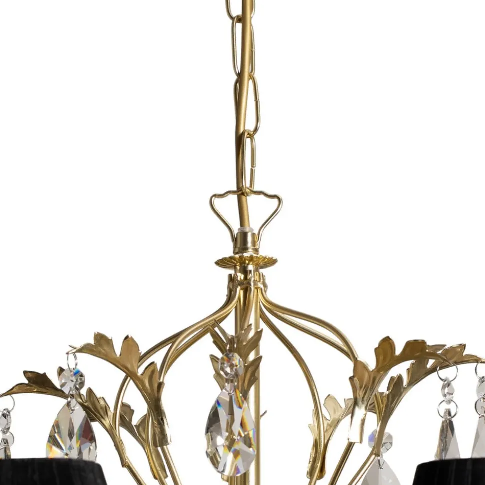 8 lyskilder Karen lysekrone i gull og svart Den buede metallrammen med åtte armer, vakre bladdekorasjoner og dekorative krystalloppheng har fått en sofistikert gylden finish. Som en sterk kontrast er lysekronen utstyrt med åtte lett gjennomsiktige skjermer i svart stoff. Disse lett koniske skjermene skjuler lyskildene og gir blendingsfritt lys og stemningsfull belysning.
