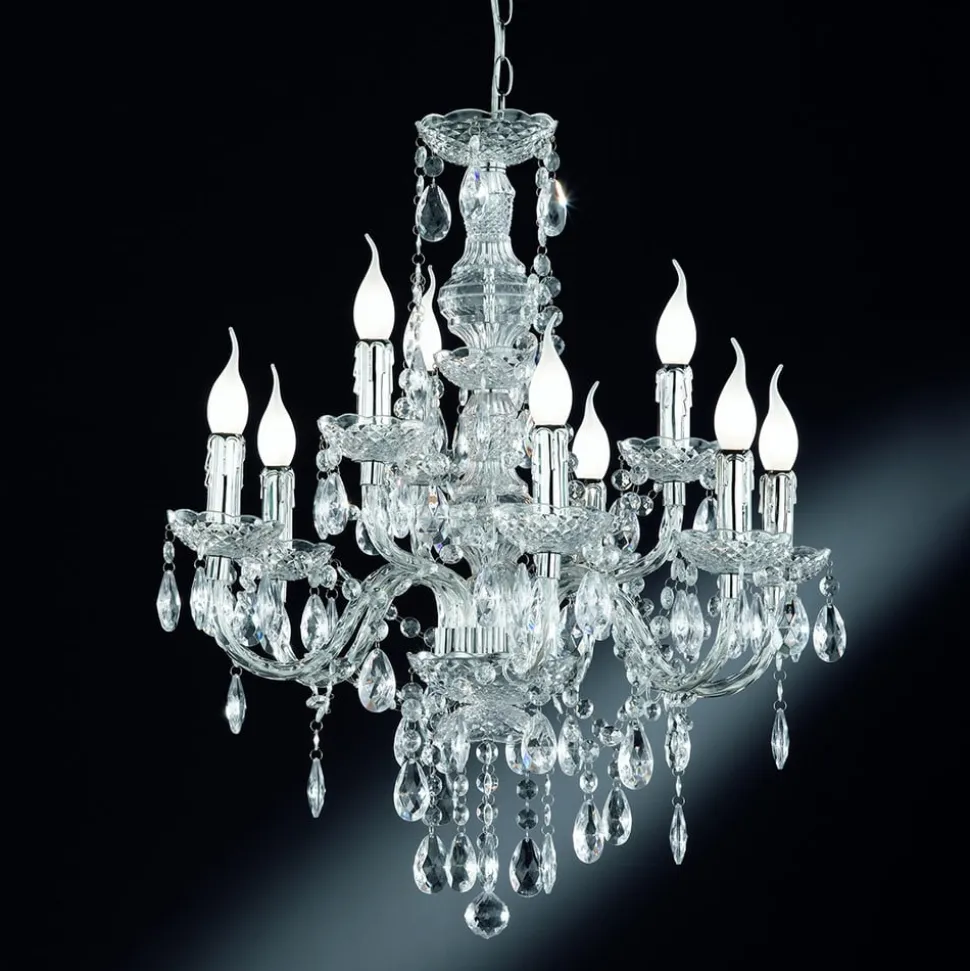 Den forkrommede Perdita-lysekronen – nine-flameMed denne imponerende lysekronen stråler enhver stue i festlig glans, for både metalldelene og de dekorative akrylsteinene er forkrommet, slik at det oppstår vakre lysreflekser og den vakkert buede Perdita-lysekronen fremstår i perfekt glans. Denne overdådig dekorerte lyskilden ser spesielt effektfull ut når vindblåselamper brukes som belysning. Disse er imidlertid ikke inkludert i leveransen, men kan kjøpes som tilbehør.