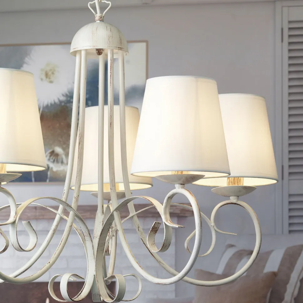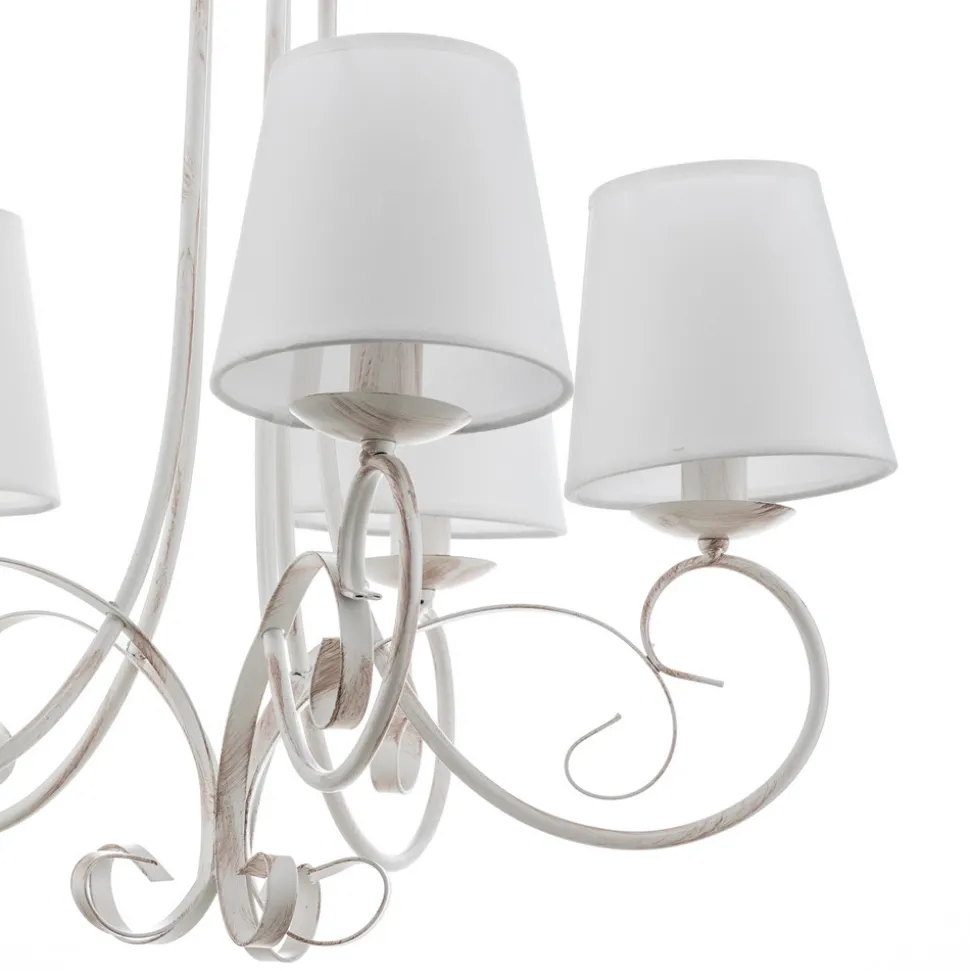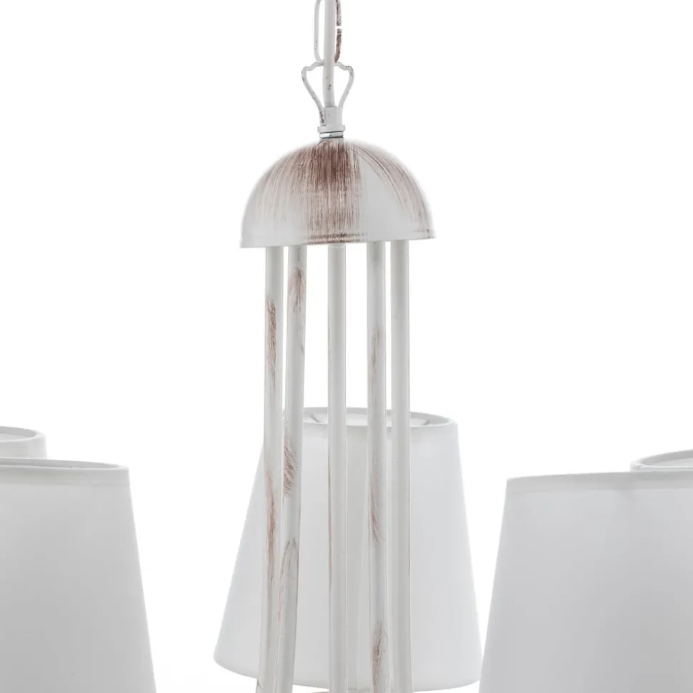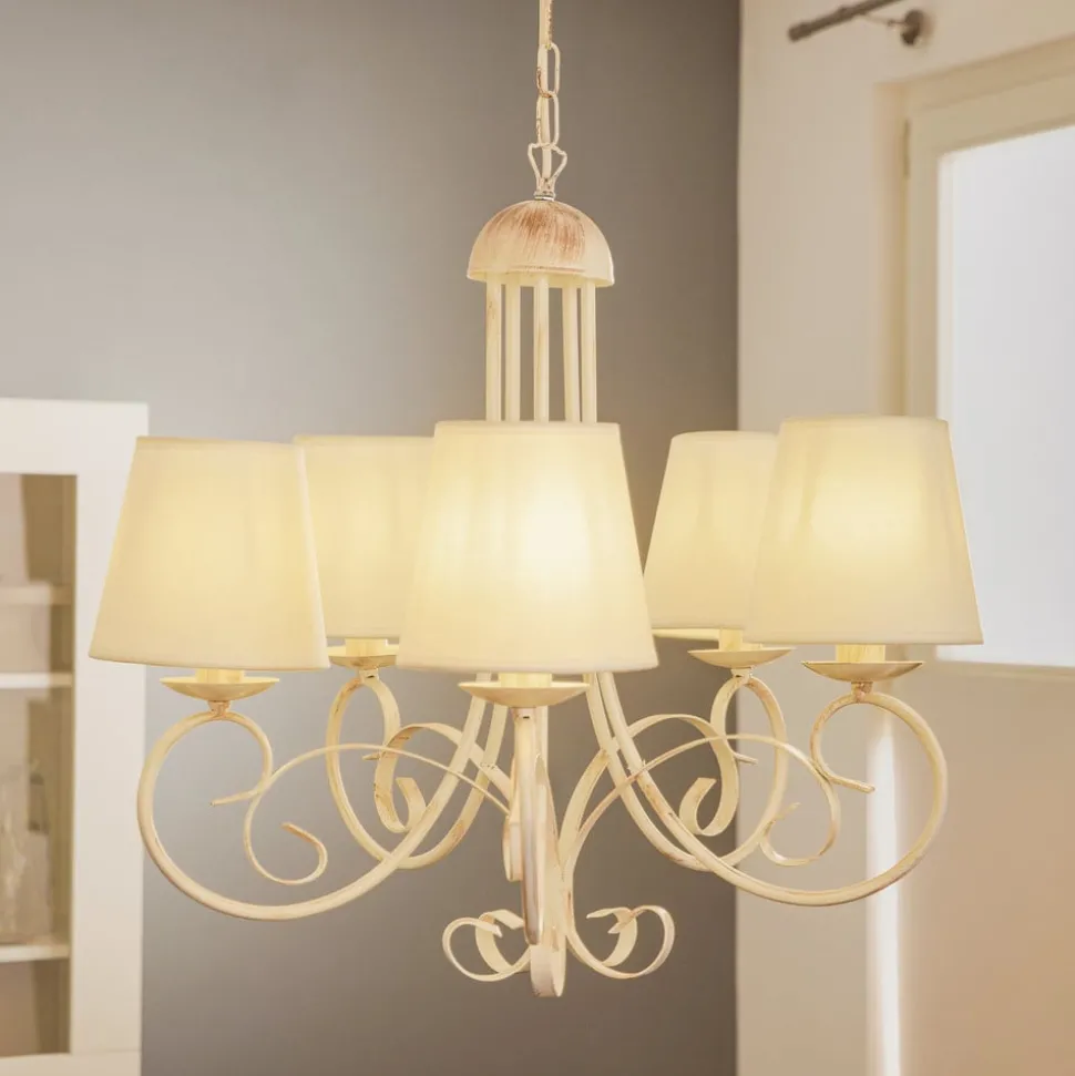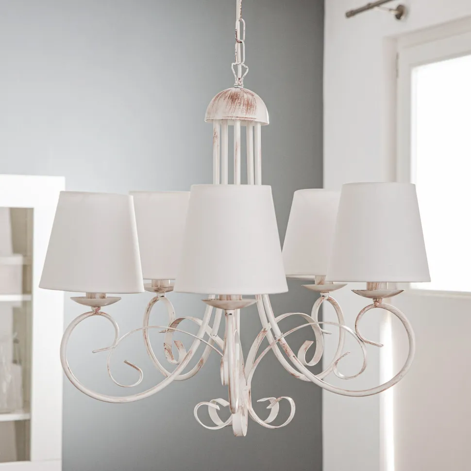 Lysekrone Pompei kombinerer rustikk sjarm med tidløs eleganse og blir et blikkfang i enhver stue eller spisestue. Den er laget av høykvalitets jern og foredlet med tekstilskjermer, og skinner i en tiltalende antikk hvit farge. Denne kombinasjonen av materialer og farger gir rommet en varm og innbydende atmosfære som passer både til tradisjonelle og moderne innredningsstiler.