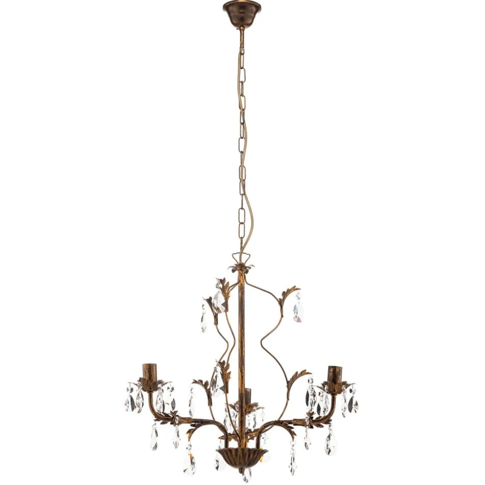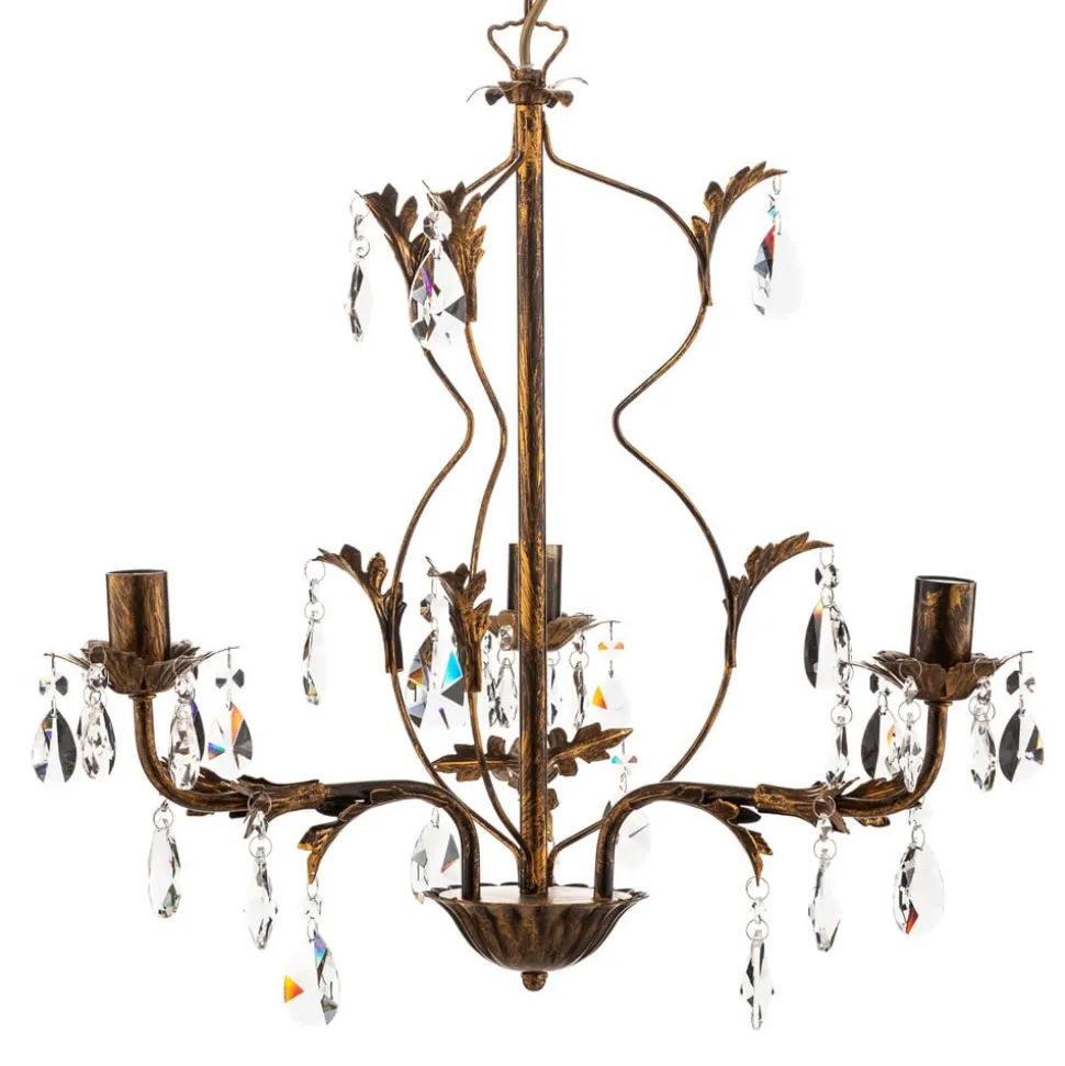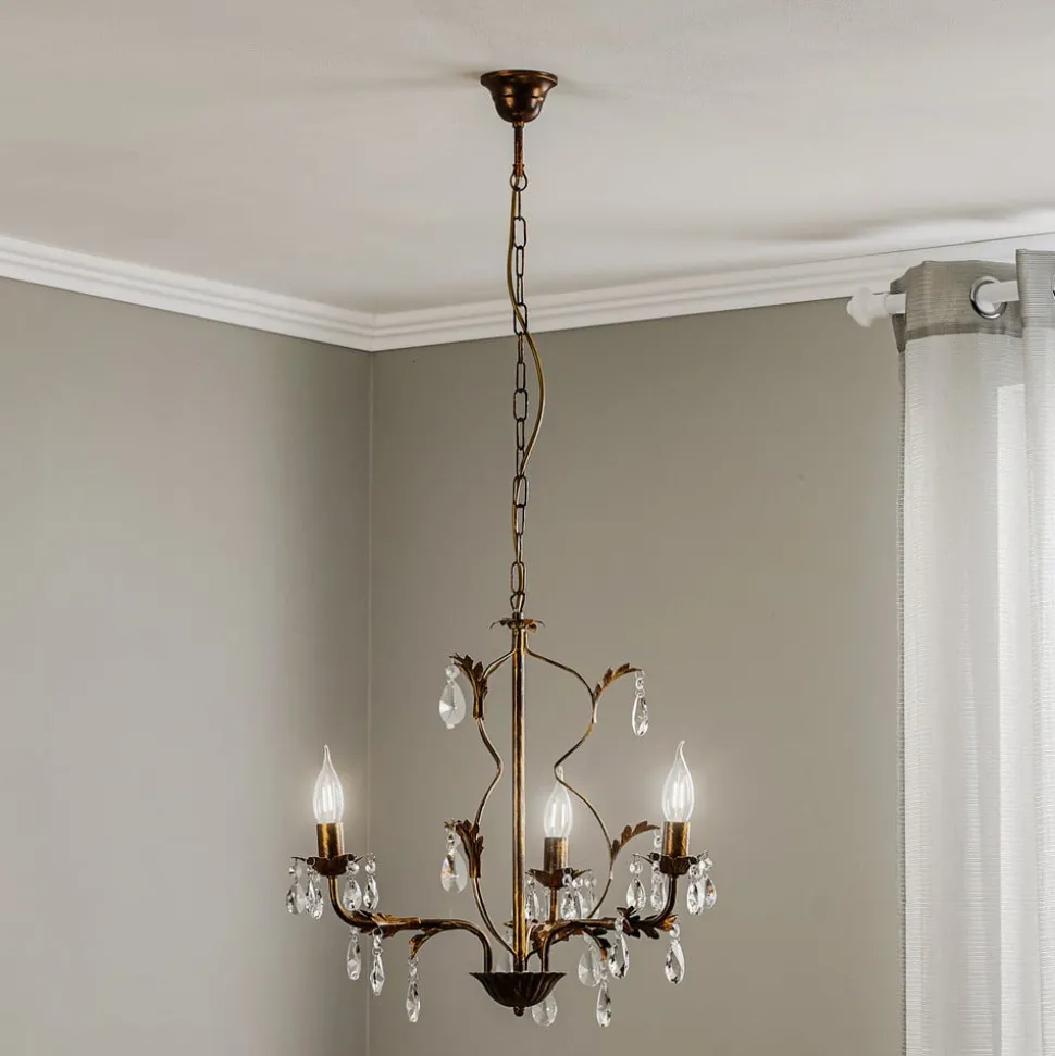 Lysekrone Teresa kombinerer antikk eleganse med moderne funksjonalitet og er laget av høykvalitets smijern og glitrende K9-krystallglass. Konstruksjonen med 3 lyskilder sørger for en jevn og imponerende lysfordeling som skaper en stilig atmosfære både i stuen og spisestuen. Kombinasjonen av antikk bronsefarge og klart krystallglass gir ethvert rom et snev av luksus og raffinement.