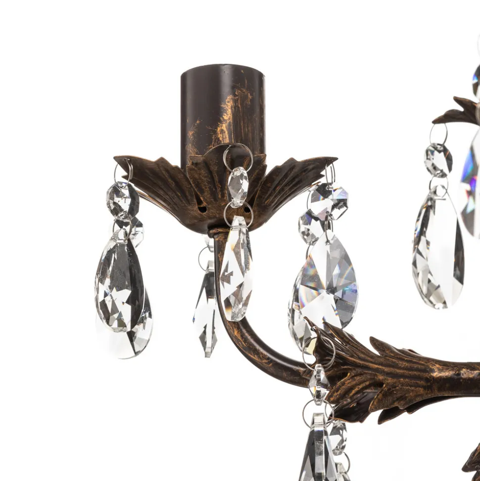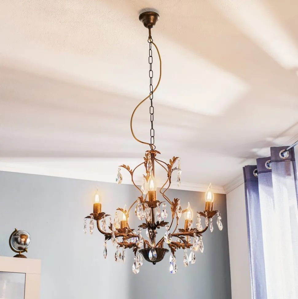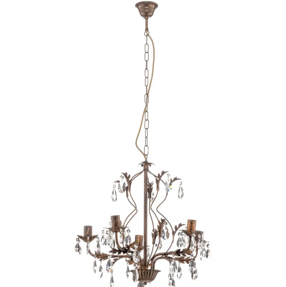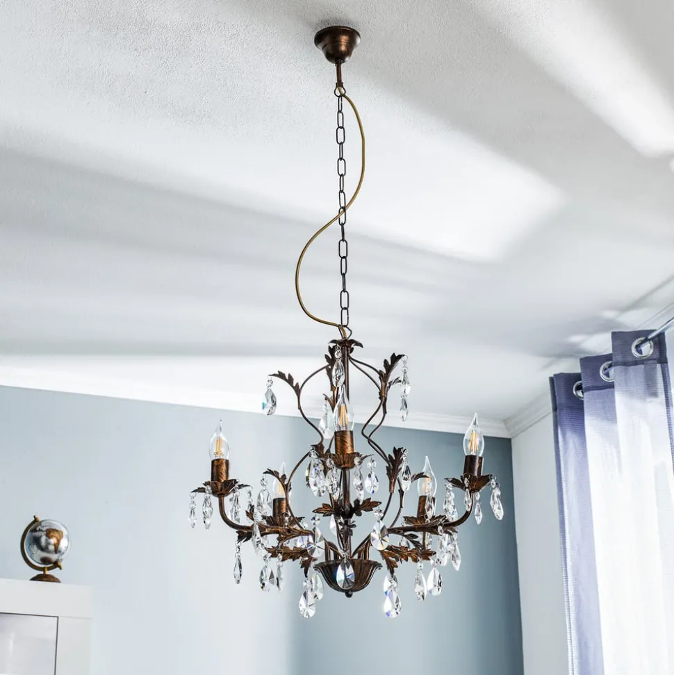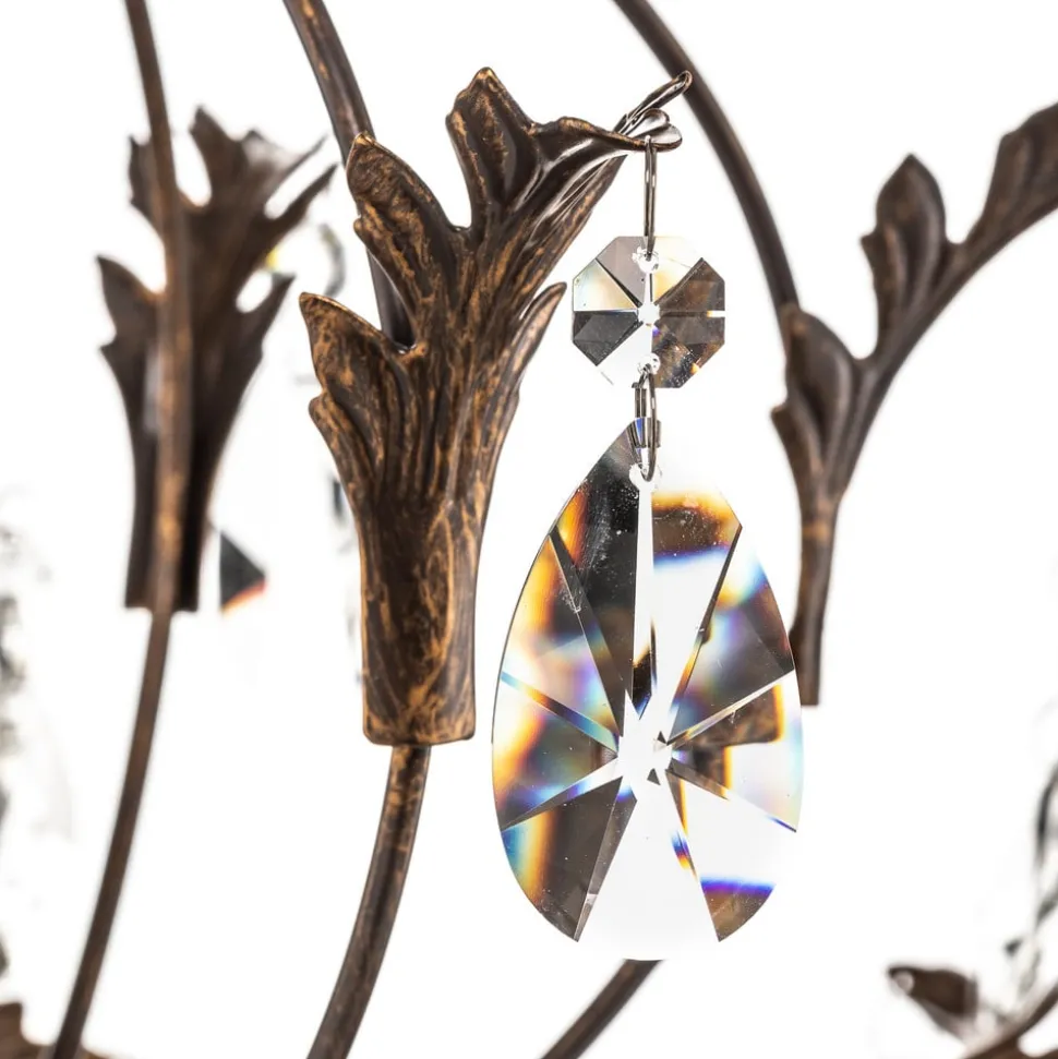 Lysekrone Teresa med krystaller og 5 lyskilder kombinerer antikk sjarm med tidløs eleganse. Den er laget av smijern og høykvalitets K9-krystallglass og gir ethvert rom en luksuriøs atmosfære. Kombinasjonen av antikk bronsefinish og klare krystaller skaper et fascinerende spill mellom lys og skygge som imponerer både i stuen, på kjøkkenet og i spisestuen.