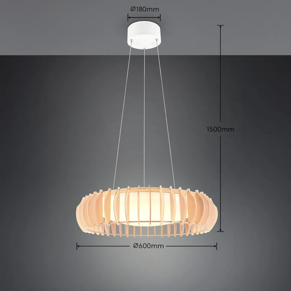 Dimbar Monte LED-pendellampe med fjernkontroll Monte LED-pendellampen er en svært dekorativ lyskilde for moderne oppholdsrom. Skjermen av lyse trelameller omgir en stor, hvit plastdiffusor som sender lyset fra de fastmonterte LED-lampene blendfritt ut i omgivelsene. Utstyrt med kontrollerbar lysfarge (CCT). Fargetemperaturen kan justeres trinnløst med den medfølgende fjernkontrollen, og den integrerte minnefunksjonen beholder den sist valgte innstillingen etter at belysningen er slått på igjen. Kan dimmes i tre trinn enten med fjernkontrollen eller den eksisterende veggbryteren. Batterier til fjernkontrollen er inkludert (2 x AAA) – med nattlysfunksjon