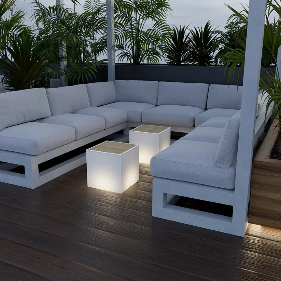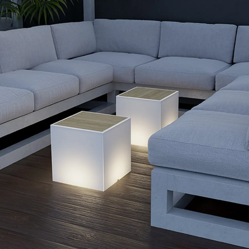 Kubeformet Bora-bord med integrert lyskilde og justerbar fargetemperatur Bora-bordet imponerer med sin kubeformede, tidløse design som gjør at det enkelt kan integreres i ulike miljøer. Designet avrundes av en integrert treplate på toppen. Bordet er allsidig og kan brukes som oppbevaringsplass eller som en enkel lyskilde. Fargetemperaturen kan varieres fra varmhvitt til dagslyshvitt ved hjelp av den medfølgende fjernkontrollen, og lyskilden kan også dimmes. Bora har kapslingsklasse IP65 og er laget av polyetylen som beskytter bordet mot ekstreme temperaturer og UV-stråling.