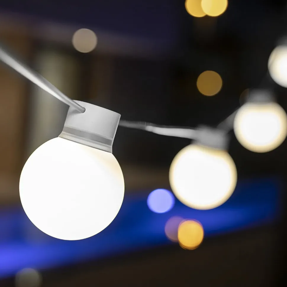 Kan brukes fleksibelt innendørs og utendørs og har også et tidløst design – LED-solcellelenke kan brukes for eksempel på balkongen, på terrassen, i stuen eller på soverommet. Det varme lyset bidrar til en koselig atmosfære. lyslenke betjenes via et solcellepanel som lagrer solens energi og kan også lades med USB-kabel. De 10 pærene er sfæriske i formen, det subtile fargevalget sørger for at lyslenke enkelt kan integreres i ulike miljøer.