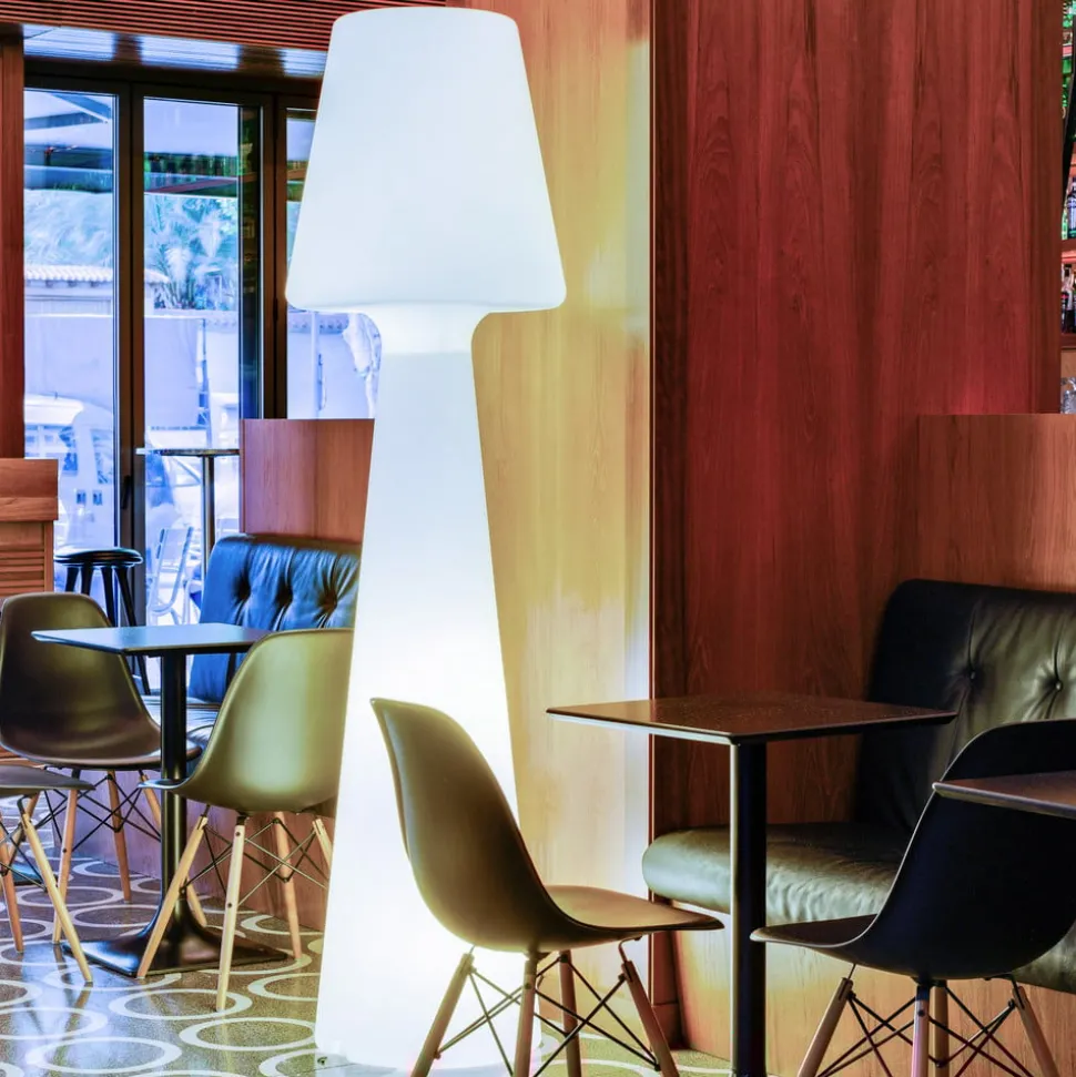 High Lola 200 LED-gulvlampe med IP65-beskyttelse Lola 200 LED-gulvlampe er laget av robust polyetylen og kan brukes utendørs uten begrensninger takket være IP65-klassifiseringen. Det varmhvite lyset skaper en hyggelig atmosfære, enten det er i stuen, i hagen, på balkongen eller på terrassen – også ideell for hoteller og restauranter
