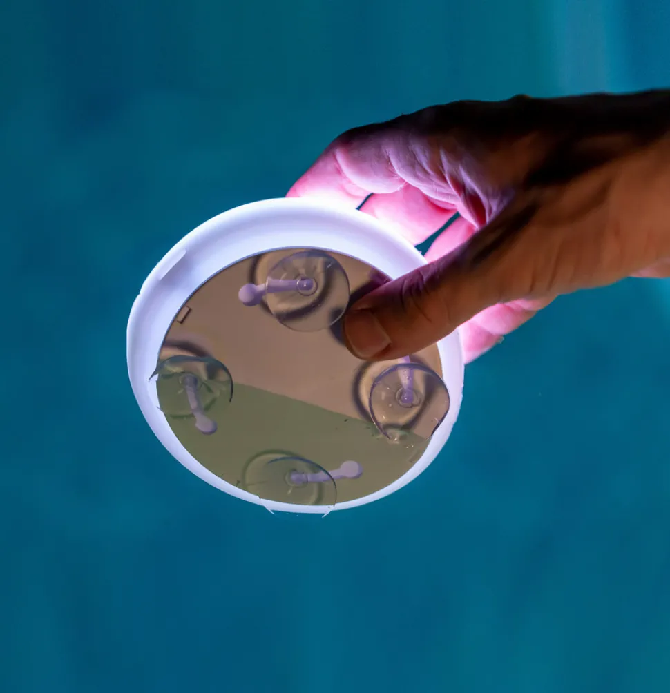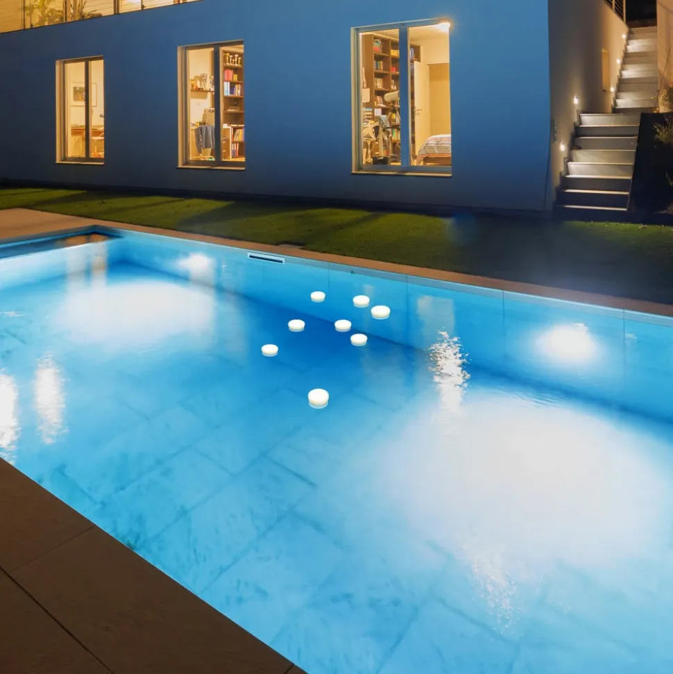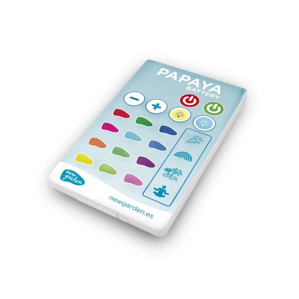 Vanntett, oppladbar LED-bassenglampe Papaya Den oppladbare Papya LED-bassenglampen er en trådløs lampe som er spesielt utviklet for bassengbelysning. Takket være den kompakte og vanntette designen kan den senkes ned til 1 meter under vann (IP 68). Papaya har en fjernkontroll som kan brukes til å styre lyset. Papaya kan installeres på to måter: med avtagbart lim eller med sugekopper, slik at den kan installeres i alle typer basseng, enten det er flislagt, grus eller andre materialer. Den kan også brukes som dekorativt flytende lys, bordlampe eller gulvlampe. Lademodus: Papaya har et magnetisk ladesystem, en sikker lademodus for vannprodukter. Armaturen trenger bare å tas ut av bassenget, så tørkes ladeområdet på armaturen, og armaturen er 100 % oppladet i løpet av kort tid – Inkluderer monteringsmateriale, ladekabel (uten strømforsyningsenhet) og fjernkontroll – Fargeskift og dimming via fjernkontroll