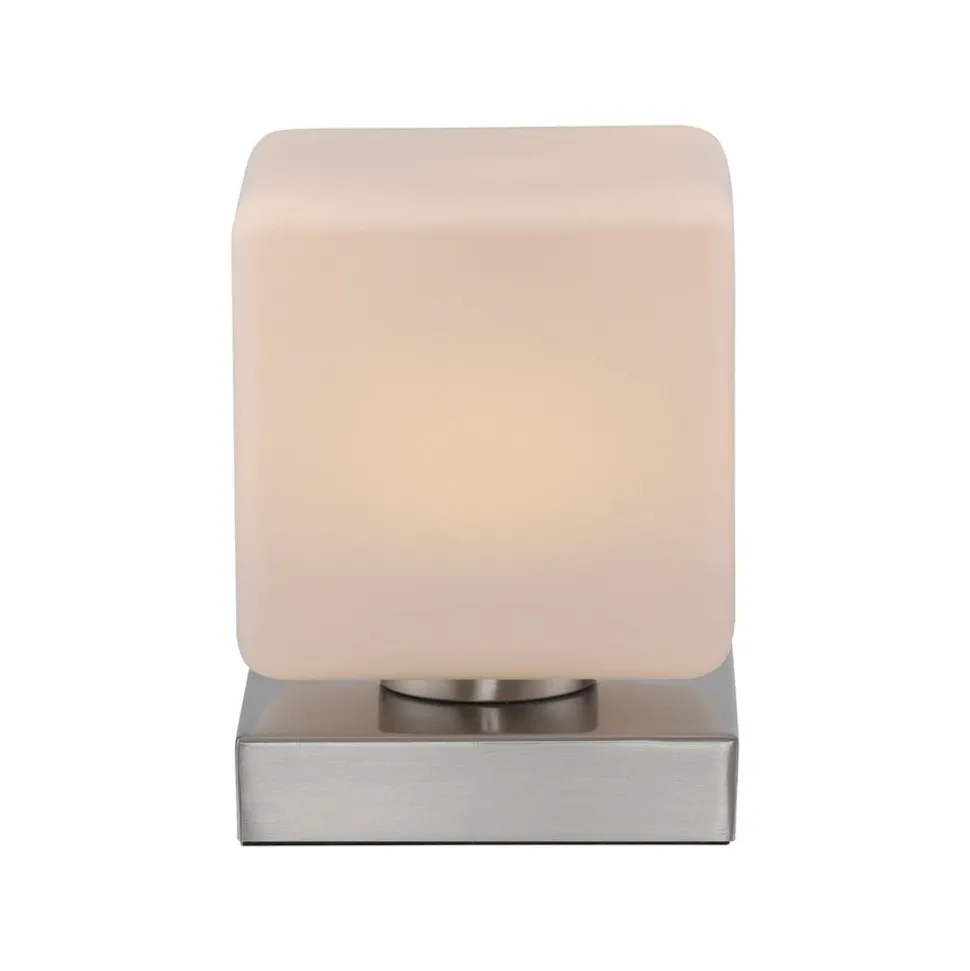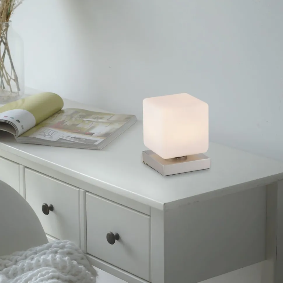 Dadoa LED-bordlampe i glass med berøringsdimmer Dadoa LED-bordlampe har en diskret, tidløs design. Lampeskjermen ser ut som en kube, montert på en firkantet lampefot. Lampens varmhvite lys skaper en hyggelig atmosfære i rommet. Den integrerte berøringsdimmeren gjør det mulig å dimme bordlampen i tre nivåer (10 %-50 %-100 %). Takket være det diskrete utseendet kan lampen integreres i alle typer innredningsstiler.