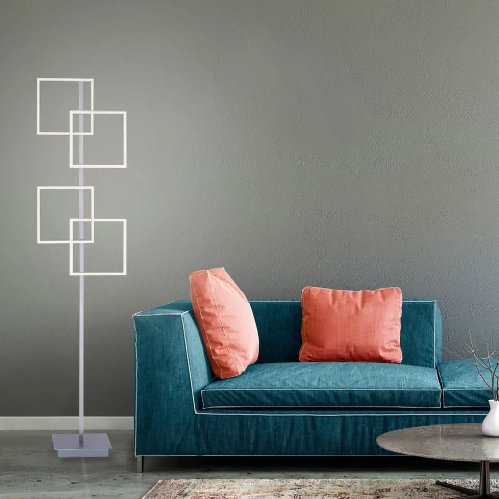 Dimbar LED-gulvlampe Inigo med CCT-funksjon og fjernkontroll Et vakkert blikkfang i hjemmet ditt: Den stålfargede LED-gulvlampen fascinerer med sin moderne, uvanlige design. Den leveres med fire fastmonterte LED-pærer og en fjernkontroll med infrarød lysstyring. Takket være den integrerte CCT-lysstyringen kan du justere fargetemperaturen på lyset fra varmhvit til dagslys-hvitt etter dine individuelle behov og dermed simulere lysfargene i hverdagen. Denne justeringen gjøres ved hjelp av den medfølgende fjernkontrollen. Du kan også lagre den tilpassede innstillingen ved hjelp av minnefunksjonen. Det er også mulig å dimme lysintensiteten på gulvlampen. Du kan enkelt slå det moderne LED-lyset av og på ved hjelp av fotbryteren. Takket være LED-teknologien som er brukt, er lampen karakterisert som energibesparende og imponerer med sin lave varmeutvikling og lange levetid.