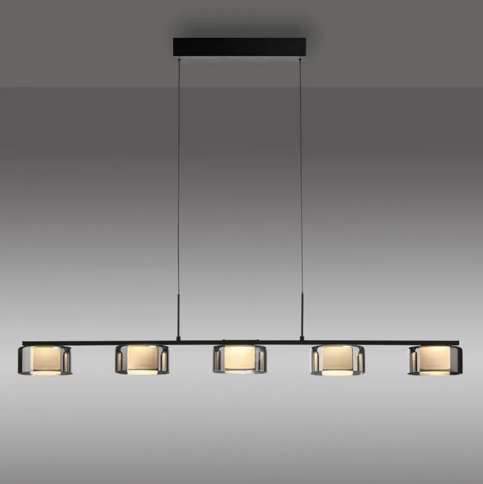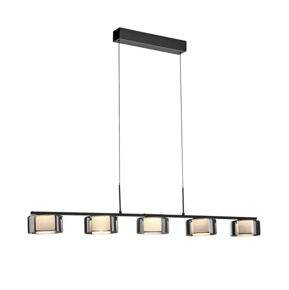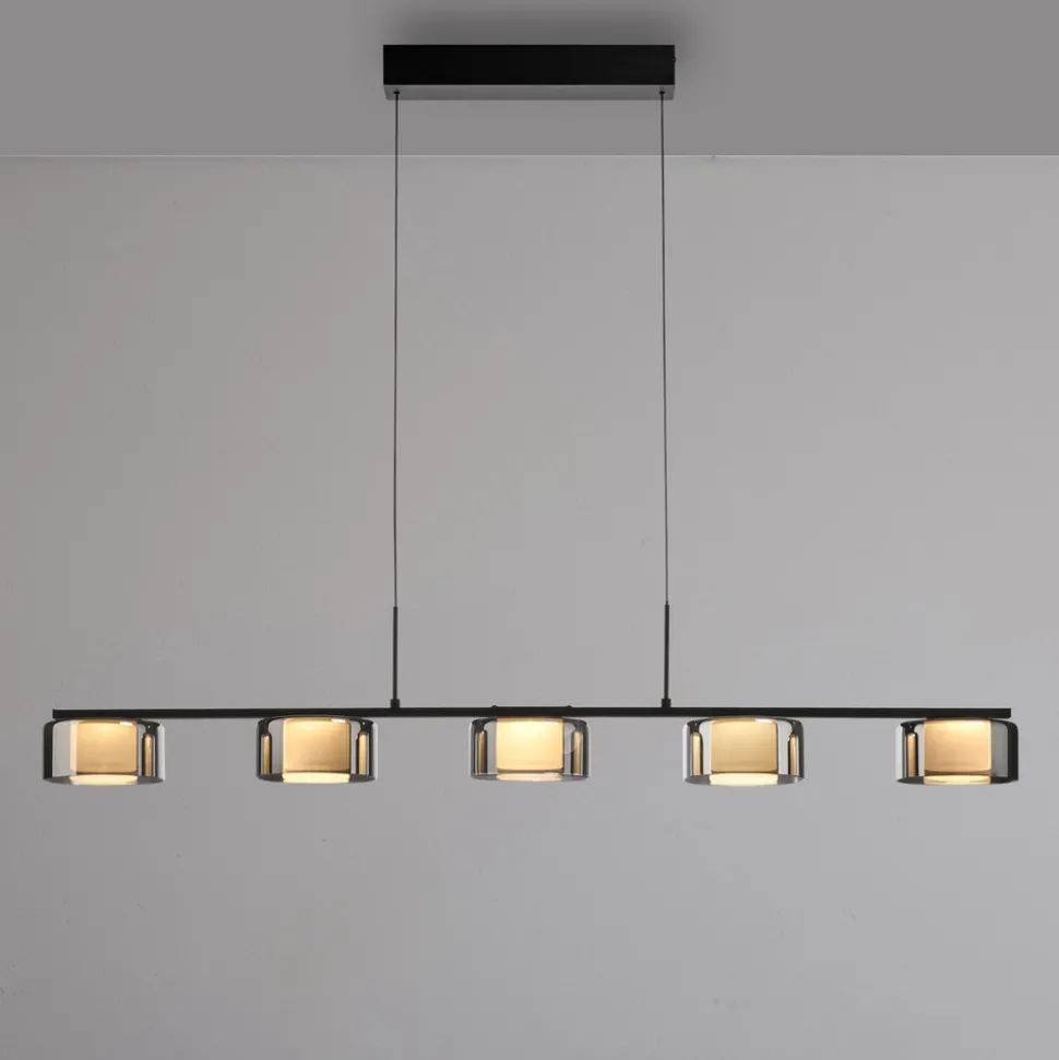 Rika LED-hengelampe i glass med Comfort-Lift- og SimplyDim-teknologi Den svarte LED-hengelampen imponerer med sin moderne, enkle design. Takket være de fem lampeskjermene i røkt glass og de varmhvite LED-pærene avgir lampen et mykt lys som skaper en innbydende atmosfære over spisebordet. Comfort-Lift-funksjonen gjør det enkelt å justere høyden. Takket være mekanismen som er innebygd i baldakinen, er irriterende motvekter ikke lenger et problem. Høydejusteringssystemet gjør det raskt og enkelt for deg å tilpasse høyden på lampen fleksibelt til ditt boareal. Pendellampen er også utstyrt med SimplyDim-teknologi. Denne funksjonen gjør at du enkelt kan dimme lysintensiteten til armaturen ved hjelp av den eksisterende lysbryteren. Dimmerteknologien styrer lysstyrken via bryterimpulsen, slik at lyset kan dimmes trinnløst fra 100 % og ned til 10 % av lysintensiteten. Hvis lyset slås på igjen mindre enn 3 sekunder etter at det ble slått av, starter dimmeprosessen. Når den har nådd den lyseste (100 %) eller mørkeste verdien (10 %), blir den stående på denne innstillingen i ca. 2 sekunder før prosessen starter på nytt. Hvis lyset lyser med ønsket lysstyrke under en prosess, kan du lagre lysintensiteten ved å slå av lyset. Hvis du slår på lyset igjen, lyser lyset med den lagrede lysstyrken, og denne innstillingen beholdes. Det gjør det mulig å justere lyset etter behov og raskt hente det frem igjen. Plasser pendellampen over spisebordet og skap en koselig atmosfære i rommet.