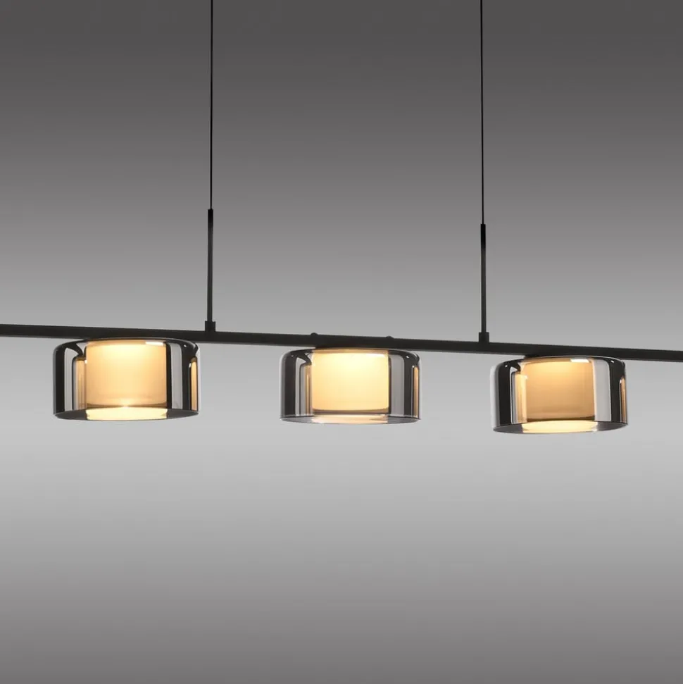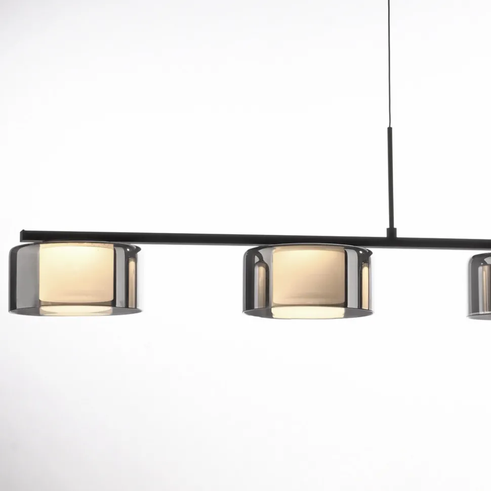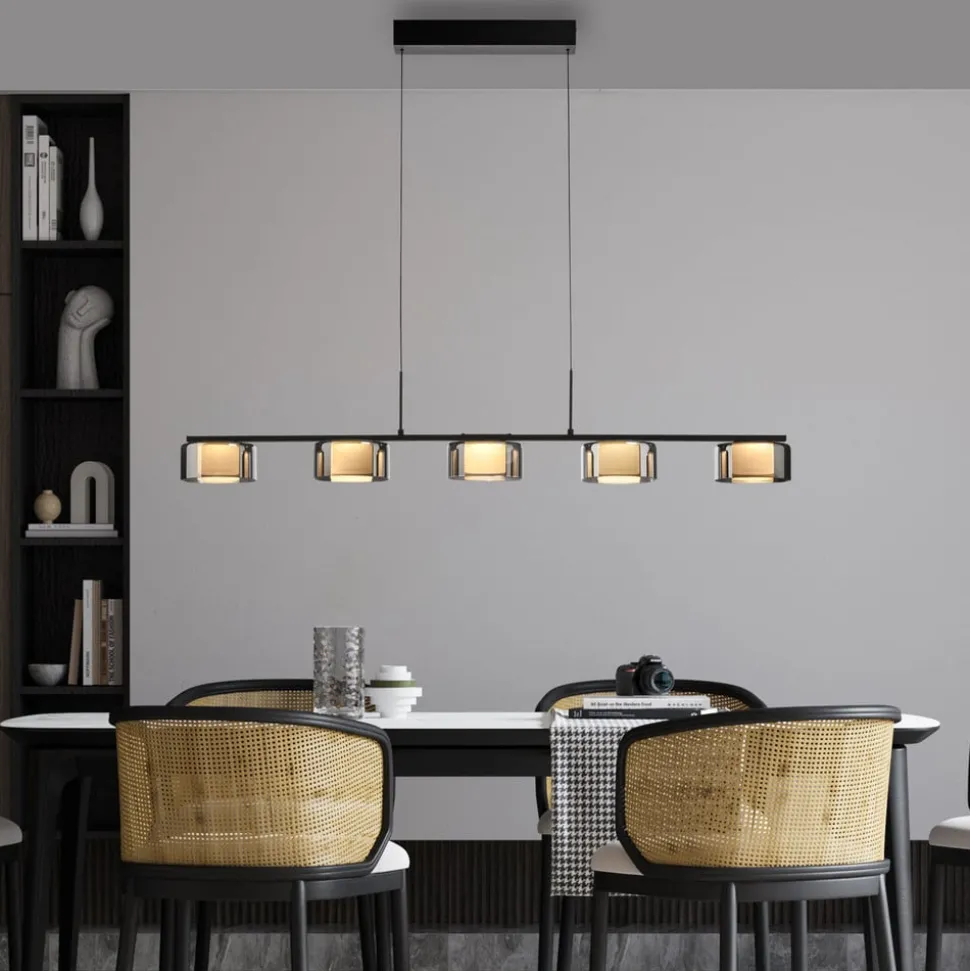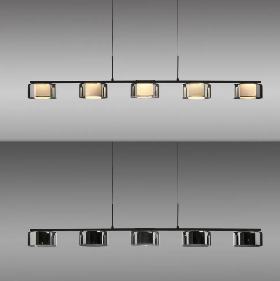 Rika LED-hengelampe i glass med Comfort-Lift- og SimplyDim-teknologi Den svarte LED-hengelampen imponerer med sin moderne, enkle design. Takket være de fem lampeskjermene i røkt glass og de varmhvite LED-pærene avgir lampen et mykt lys som skaper en innbydende atmosfære over spisebordet. Comfort-Lift-funksjonen gjør det enkelt å justere høyden. Takket være mekanismen som er innebygd i baldakinen, er irriterende motvekter ikke lenger et problem. Høydejusteringssystemet gjør det raskt og enkelt for deg å tilpasse høyden på lampen fleksibelt til ditt boareal. Pendellampen er også utstyrt med SimplyDim-teknologi. Denne funksjonen gjør at du enkelt kan dimme lysintensiteten til armaturen ved hjelp av den eksisterende lysbryteren. Dimmerteknologien styrer lysstyrken via bryterimpulsen, slik at lyset kan dimmes trinnløst fra 100 % og ned til 10 % av lysintensiteten. Hvis lyset slås på igjen mindre enn 3 sekunder etter at det ble slått av, starter dimmeprosessen. Når den har nådd den lyseste (100 %) eller mørkeste verdien (10 %), blir den stående på denne innstillingen i ca. 2 sekunder før prosessen starter på nytt. Hvis lyset lyser med ønsket lysstyrke under en prosess, kan du lagre lysintensiteten ved å slå av lyset. Hvis du slår på lyset igjen, lyser lyset med den lagrede lysstyrken, og denne innstillingen beholdes. Det gjør det mulig å justere lyset etter behov og raskt hente det frem igjen. Plasser pendellampen over spisebordet og skap en koselig atmosfære i rommet.