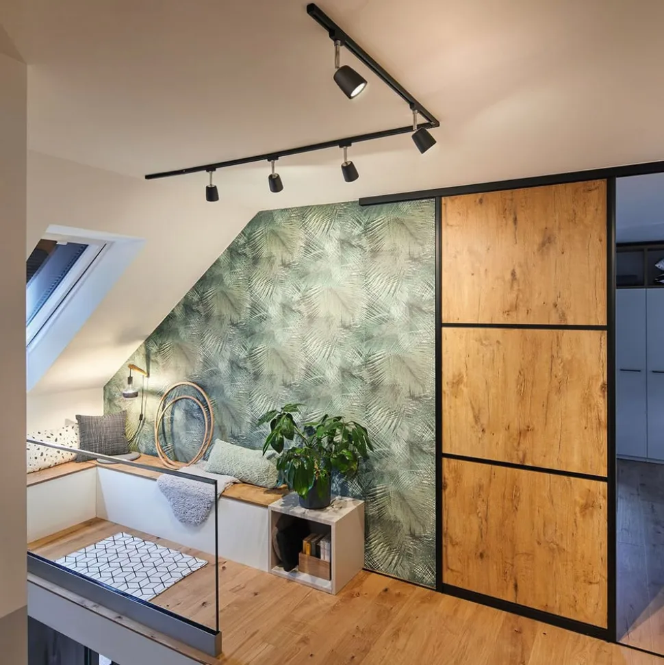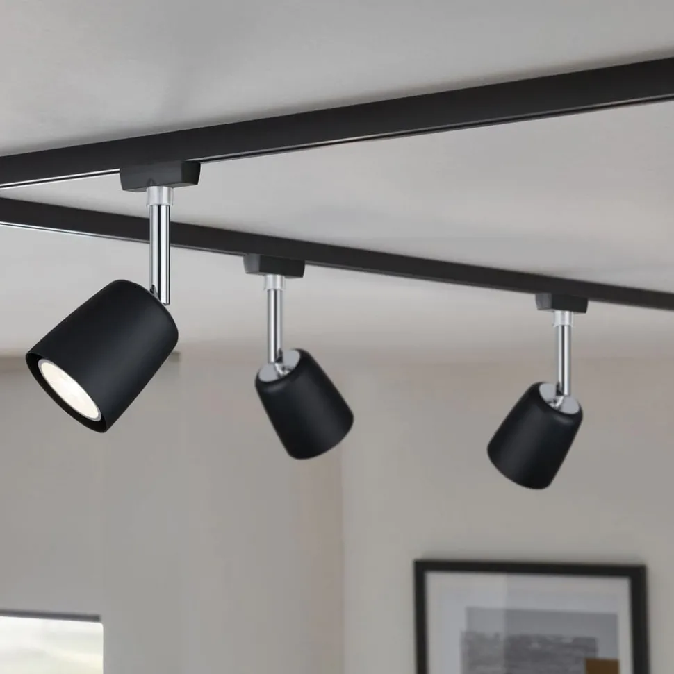 URail spotlight Cover har en sylindrisk form som smalner litt mot toppen. Den nedre enden har en rett, åpen ende, noe som betyr at lyset kan gå ut direkte og retningsvis. Den kromfargede braketten står i kontrast til den svarte kroppen og danner dermed en subtil detalj av dette stedet. lampehode er bevegelig og kan derfor justeres slik du ønsker. Enkel montering i et URail skinnesystem er garantert. GU10- fatning kan utstyres med hvilken som helst GU10-lampe.