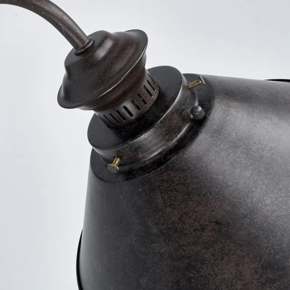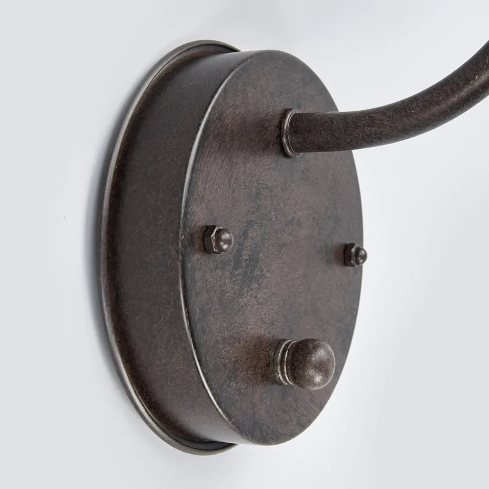Den stilige vegglampen i jern med brun oksidert antikk-look er et flott blikkfang i enhver hage. To dekorative buer over glasset fremhever i tillegg den rustikke stilen. Lampen tilhører en lampeserie i sjarmerende stil som er produsert på en kunsthåndverksmessig måte og overbeviser med sin dekorative design.