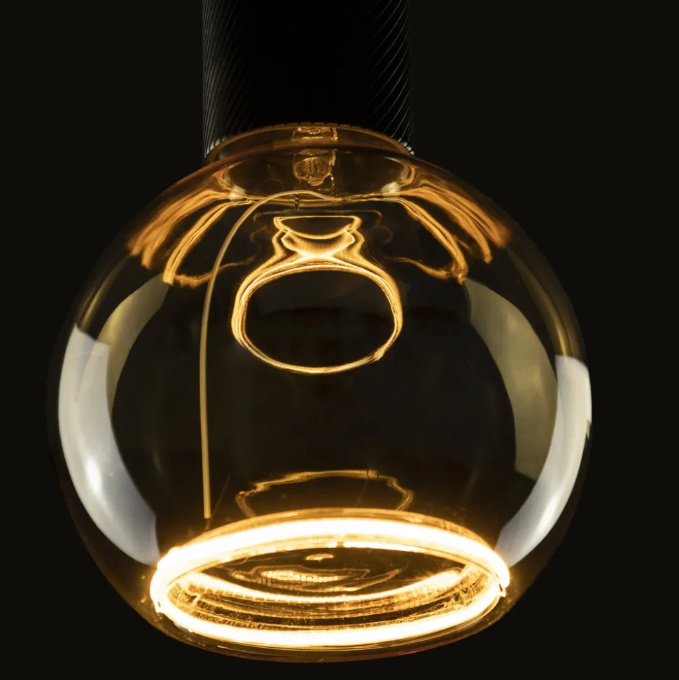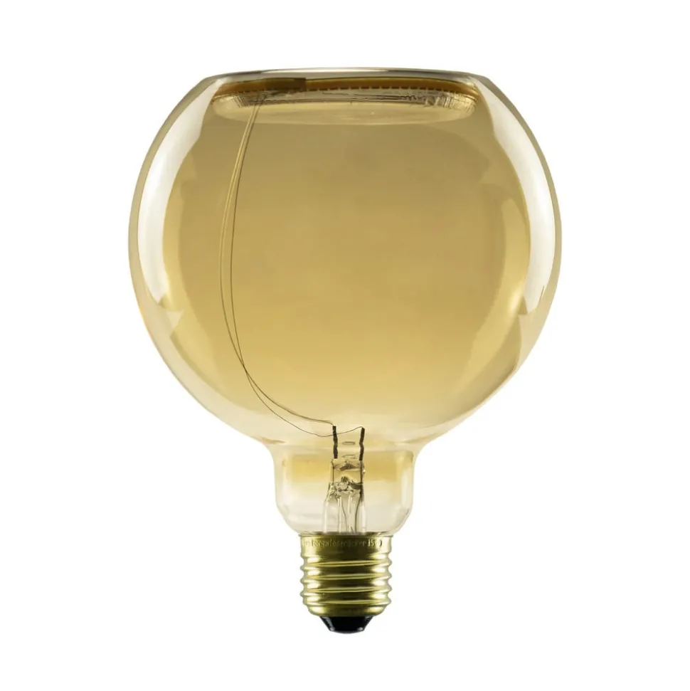 Fra Floating-serien: LED-globelampe E27 G125 4W med gullfarget, lukket glass, dimbar I tillegg til sitt uvanlige, men svært dekorative utseende, kjennetegnes denne LED-globelampen først og fremst av den svært varme lysfargen i kombinasjon med det gullfargede glasset, samt at den kan dimmes med de fleste vanlige dimmere. Den egner seg spesielt godt til armaturer uten skjerm og overbeviser med sin lyseffekt, blant annet takket være den høye fargegjengivelsen. Denne globelampen fra floating-serien fra SEGULA er laget med et dobbeltvegget glass med gullfarget fargetone og en patentert LED soft filament som er innebygd i glasset som en ring. Dimbar med de fleste vanlige dimmere – Med lukket glass, derfor egnet for utendørs bruk i kombinasjon med en vanntett fatning – Svært god koblingsmotstand (100 000 koblingssykluser) – IP65 – Tildelt Plus X Award 2022/2023 i kategoriene innovasjon, høy kvalitet og design