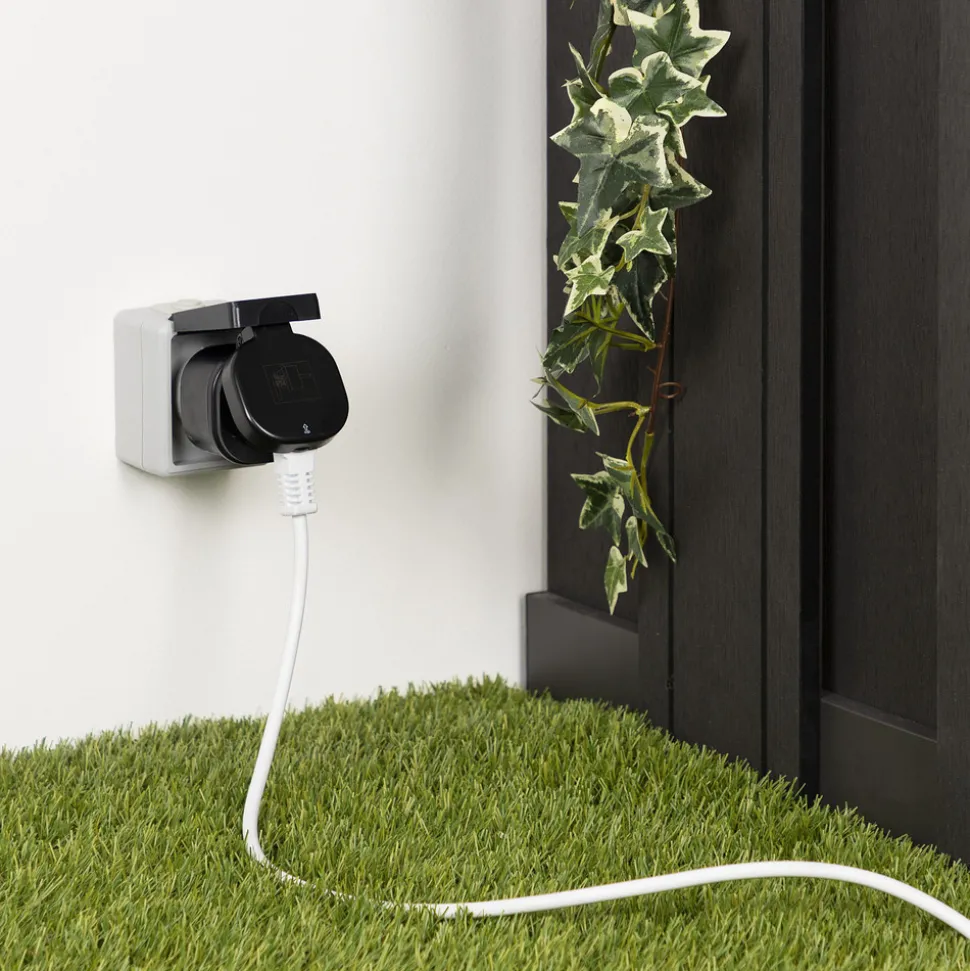 Perfekt for utendørs bruk – SH4-99653 mini-radiostyrt stikkontakt inkludert fjernkontroll Den IP44-beskyttede SH4-99653 mini-radiostyrte stikkontakten er ideell for praktisk styring av hagebelysning, enten det er sommer eller vinter. Settet inneholder to låsbare trådløse adapterplugger og den tilhørende fjernkontrollen. Denne har tre kanaler og en hovedbryter. De radiostyrte stikkontaktene er hver for seg egnet for apparater med en samlet effekt på opptil 3 000 W, slik at selv kraftige forbrukere kan betjenes. Stikkontakten kan også kjøpes separat som en forlengelse (se tilbehør). Radiofrekvens: 433,92 MHz Rekkevidde: 30 m Pluggtype: Schuko Total effekt for tilkoblede forbrukere: maks. 3 000 W