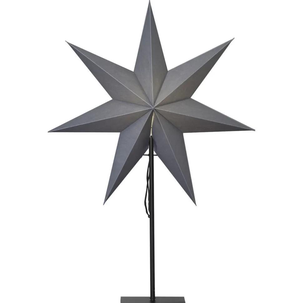 Høy, stående stjerne Ozen i grått papir Den stående stjernen Ozen, som er montert på en grålakkert metallramme, er diskret i utseendet, men har en sterk tilstedeværelse. Denne vakre dekorasjonslampen kan også brukes til å dekorere et rom med moderne møbler i en diskret og julete stil. Utstyrt med en svart tekstilkabel. Bryteren for å slå av og på er integrert i kabelen. Leveres uten pærer. Passende pærer er tilgjengelige via tilbehøret.