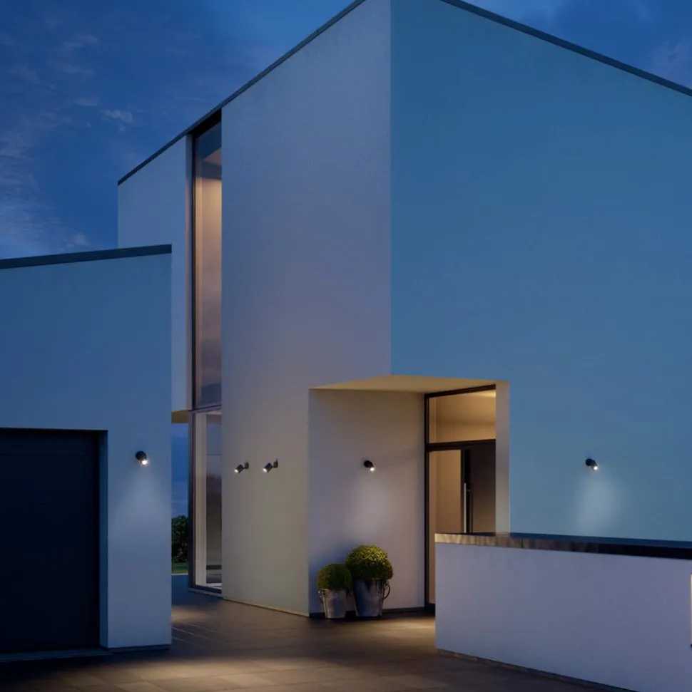 Med denne klart strukturerte LED utendørs spotlighten kan fasader i alle stiler foredles: spot One S kan svinges horisontalt 180° og vertikalt 90°, noe som betyr at retningen på belysningen kan endres veldig individuelt. Flere spots kan også kobles sammen via kabel. spot One S kommer med en utskiftbar LED-pære med GU10-sokkel.