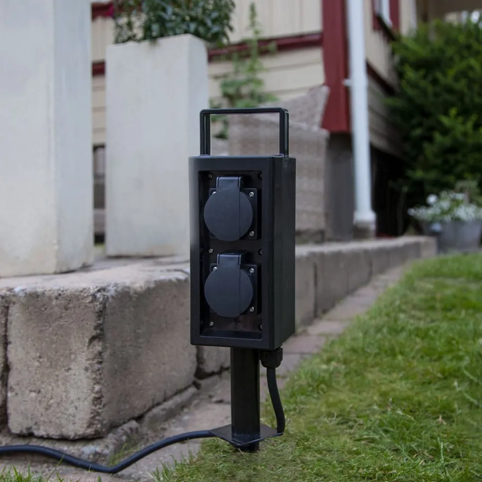 Plugge stikkontaktsøyle med fire uttak og 200 cm tilkoblingskabel med støpsel Plugge firedobbel utendørs stikkontakt kan raskt og enkelt settes i bakken på ønsket sted takket være jordspydet, og er utstyrt med en 200 cm lang kabel med støpsel for tilkobling til en annen stikkontakt eller en skjøteledning. Den tilbyr et fleksibelt tilkoblingsalternativ for forsyning av elektriske apparater utendørs med en maksimal total effekt på 3860 W.