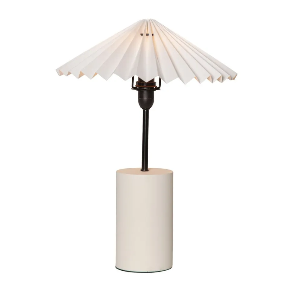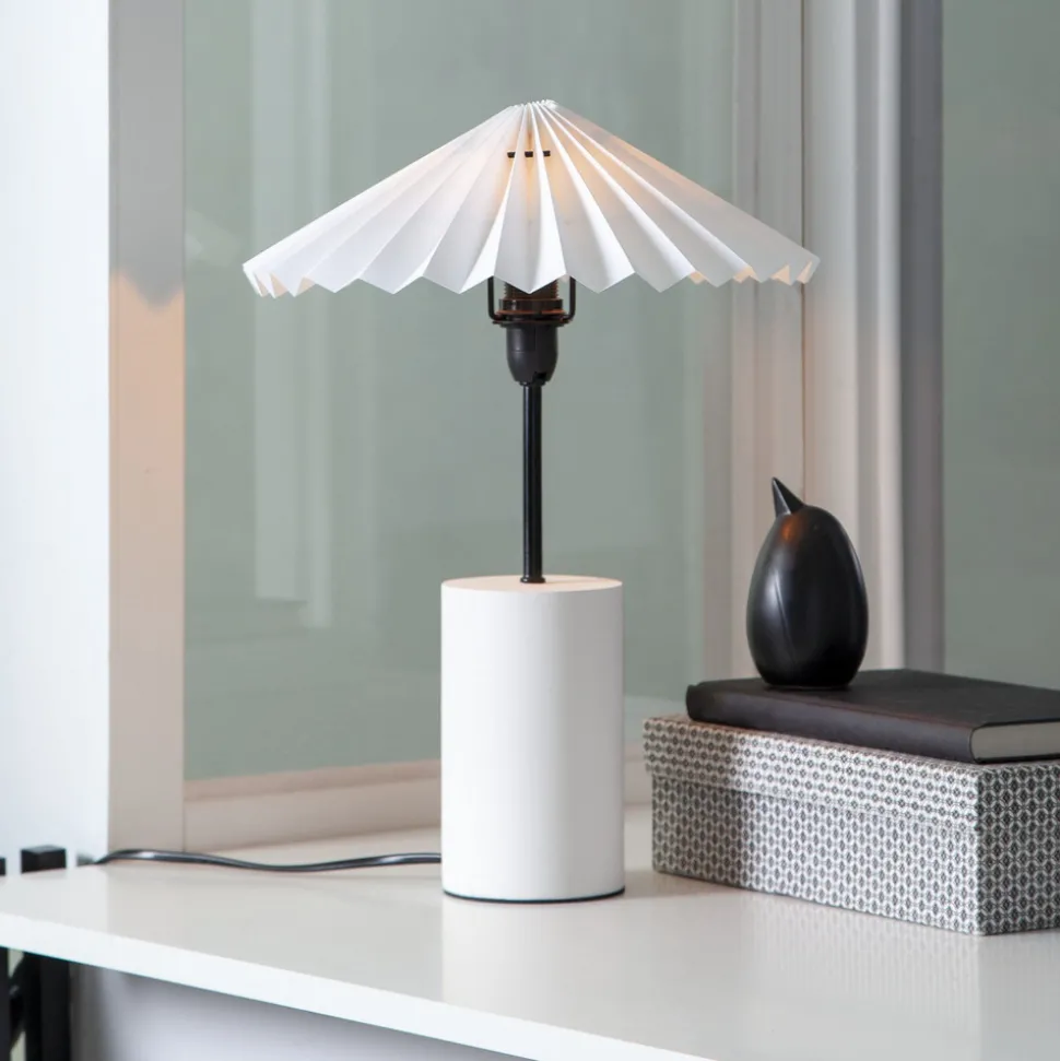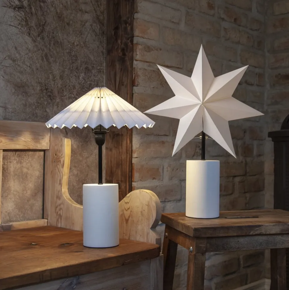 Hvit Stila bordlampe med utskiftbare lampeskjermer Stila bordlampe kan forvandles fra en enkel ekstra lyskilde til en lysende juledekorasjon på et øyeblikk. To hvite lampeskjermer i papir følger med – en flat, plissert skjerm for helårsbelysning og en stjerne for julebelysning. Den sylindriske, hvite sokkelen er også laget av tre.