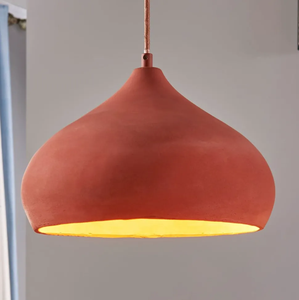 Spisebordet – uansett om det befinner seg i kjøkkenet eller i oppholdsrommet – er alltid et optimalt valg til å sørge for flotte lysforhold og en inndbydende atmosfære med en stilfull pendellampe. Dersom man følger en innretningsstil som skal virke noe mer mediterran og som også minner litt om industristilen man først og fremst møter i ombygde fabrikkbygninger, i de såkalte lofts, er pendellampen Fiona en meget god anbefaling, fordi dens formskjønne skjerm er fremstilt av betong og deretter lakkert i terracottafarger.