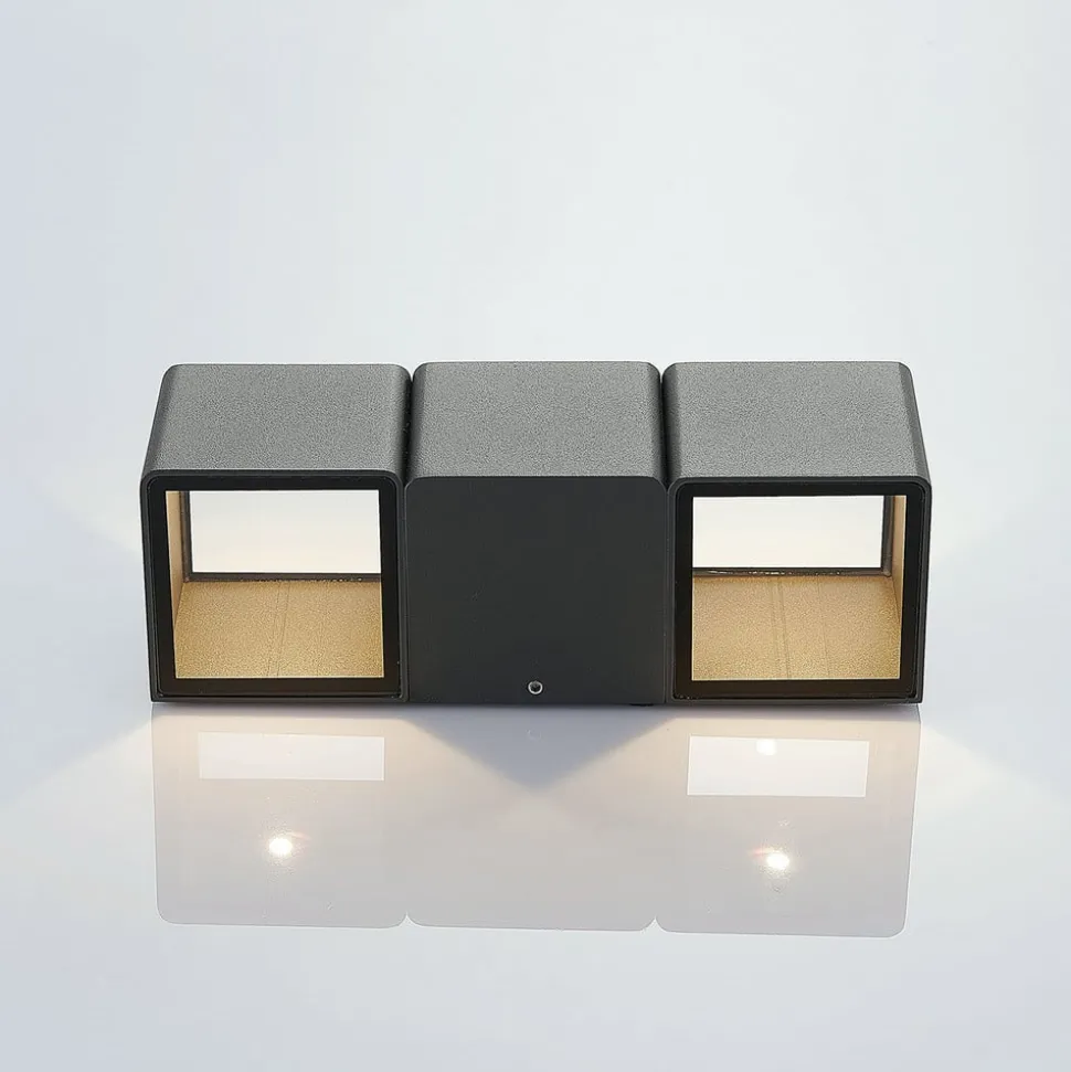 Utevegglyset har kapslingsgrad IP54 og ser enkelt og rettlinjet ut når det er av, men utfolder seg i sin fulle prakt når lyset slås på. Da ser man et lysbilde med flere kjegler på veggen, to stråler oppover og to nedover. LED-teknikken garanterer lavt strømforbruk og overflaten til aluminiumshuset er holdt i den tidløse fargen mørk grå. Den kan særlig anbefales til moderne hus.