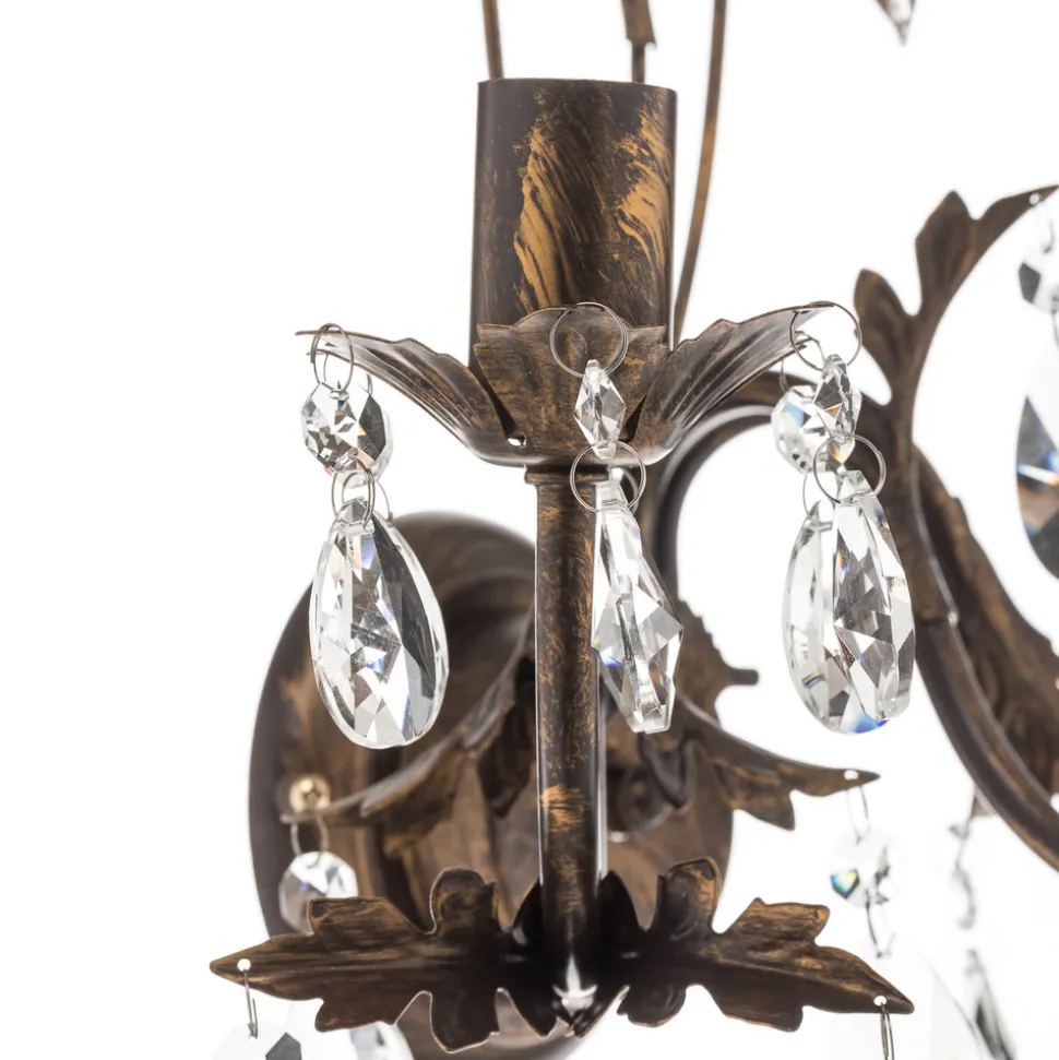 Vegglampe Teresa som lysekrone med 3 lyskilder kombinerer kunstferdig smidd jern med edelt K9-krystallglass og gir ethvert rom en edel atmosfære. Den antikke bronseoptikken harmonerer perfekt med de klare krystallelementene og skaper et fascinerende lysspill som imponerer både i stuen, gangen eller spisestuen.