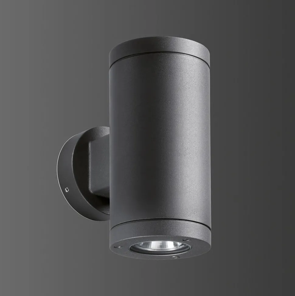 Utendørs vegglampen 1060 imponerer med sin robuste utførelse. Den består utelukkende av støpt aluminium, lyskildene er skjermet med flottørglass. En GU10- fatning er innebygd i den rørformede skjerm øverst og nederst.