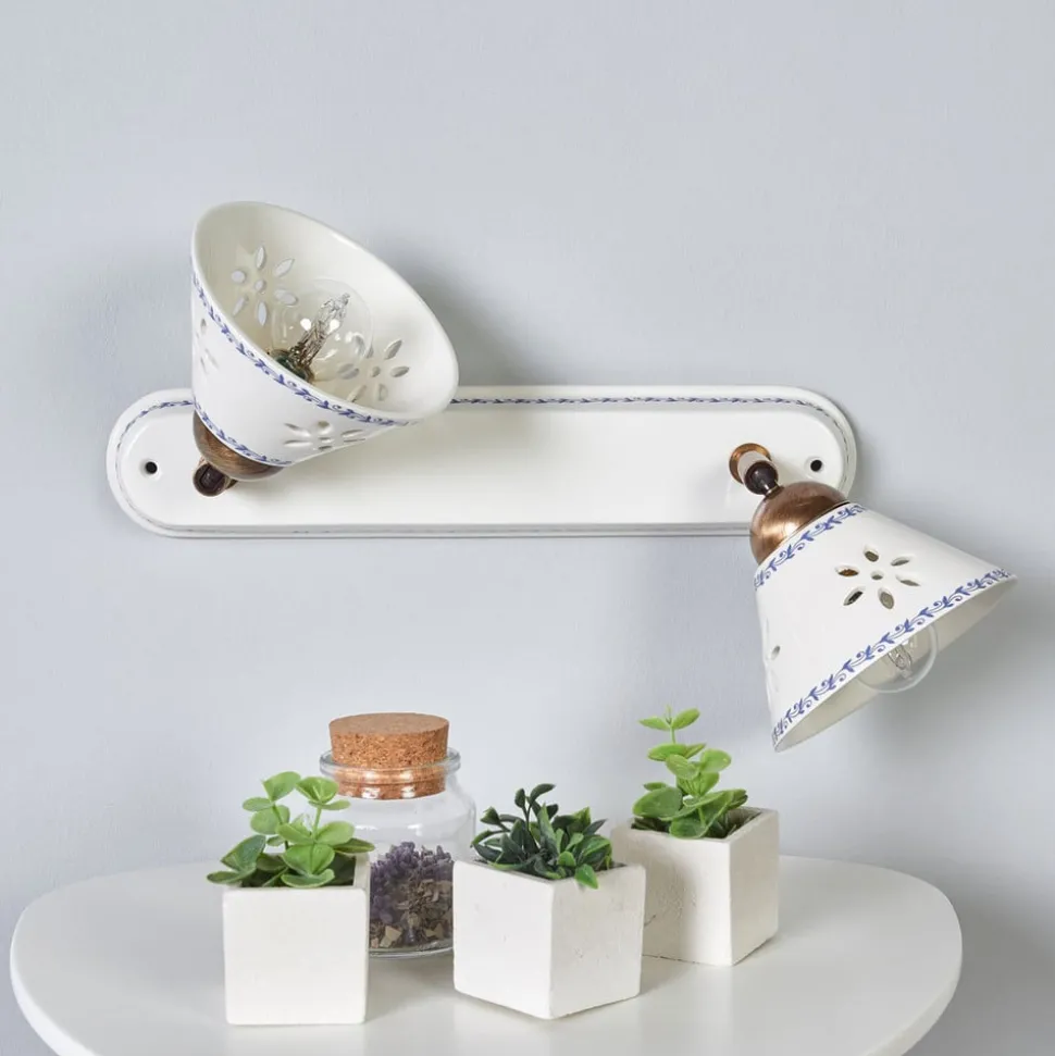 NONNA vegglampe: modernitet i tradisjonell forkledning Vegglampen NONNA forener tradisjon og modernitet gjennom kombinasjonen av keramikk og metall. Lampeskjermene og veggskinnen er laget av hvit keramikk med et blått dekorativt bånd, mens lampeskjermholderne er laget av metall. Begge lampeskjermene er dekorert med et perforert mønster i form av blomster. Romantisk belysning for koselige timer Med en effekt på 2 x 40 watt skaper vegglampen et stemningsfullt lys som innbyr til avslapping. Rom i landlig stil kompletteres perfekt av den sjarmerende, nostalgiske vegglampen. På denne måten får selv en vanlig gang en varm og koselig atmosfære som ønsker både beboere og gjester velkommen.