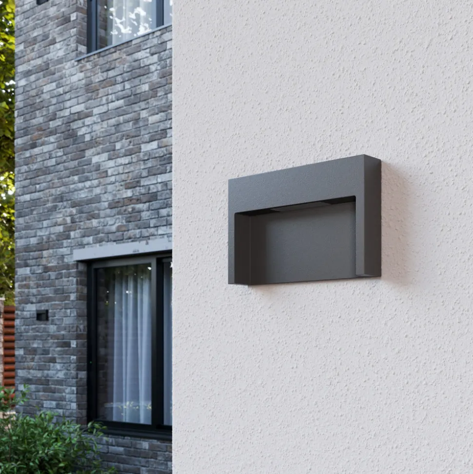 Indirekte belysning med utendørs vegglampe Mitja, inkl. Cree-lysdioder Grafittgrå er en diskret og tidløs farge, noe som gjør at den innfelte vegglampen Mitja kan brukes på mange forskjellige måter i uteområdene til hus og bygningskomplekser. LED-lampen av merket Cree med en varmhvit lystemperatur på 3000 Kelvin er plassert i armaturen slik at den ikke er direkte synlig fra de fleste perspektiver, og gir fortrinnsvis indirekte belysning rettet mot bakken. Armaturen leveres med en passende innbyggingsboks, og monteringsdybden er 5,6 cm.
