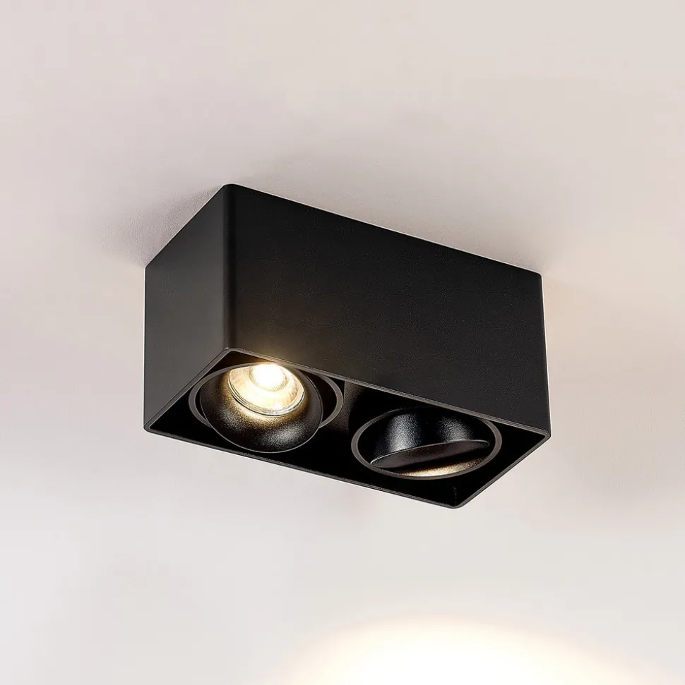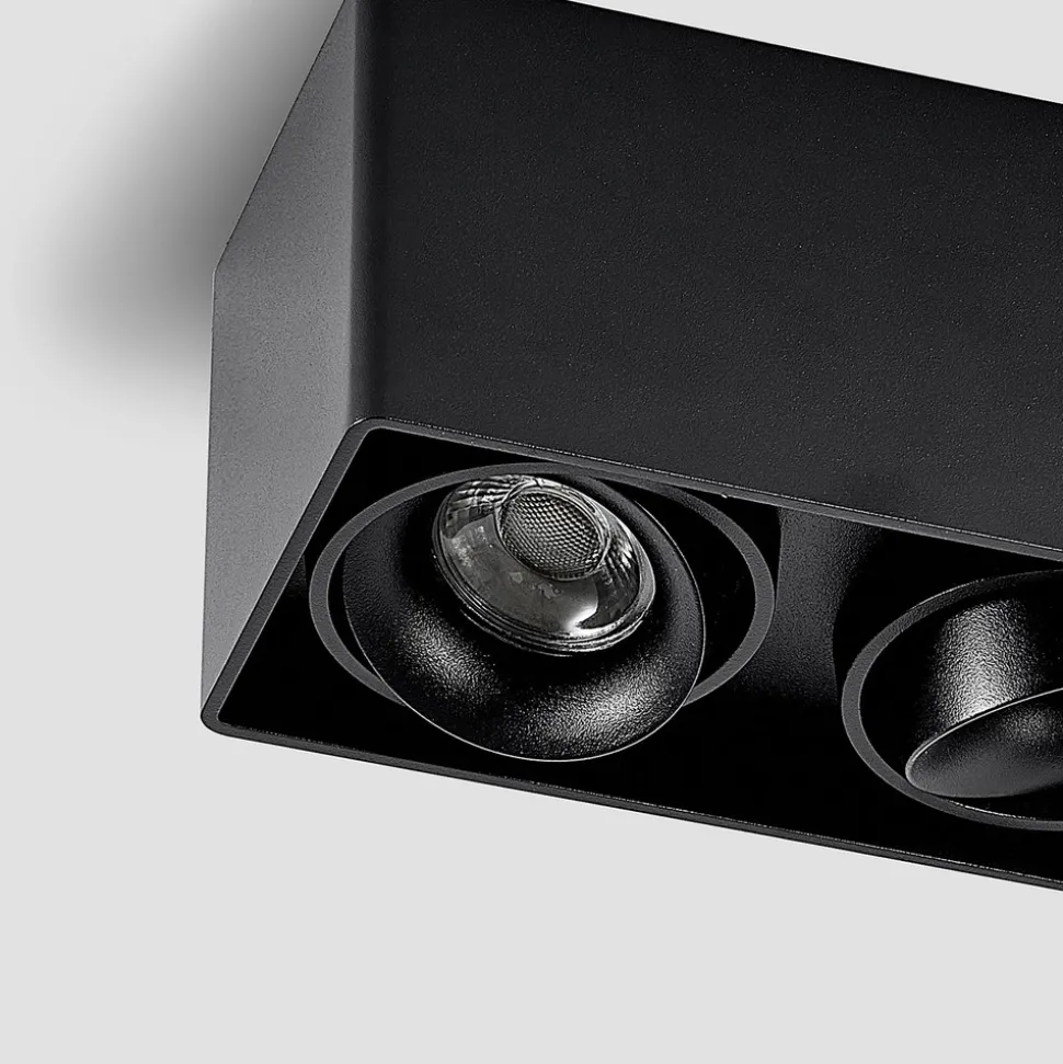 2 lyskilder taklampe Kubika av aluminium Den rektangulære taklampen Kubika imponerer med sin minimalistiske design og klassiske fargevalg. Armaturhuset er laget av aluminium og har en svart finish. Den har plass til to GU10-fatninger som passer til matchende reflektorpærer. Reflektorpærene har en direkte nedadrettet stråleretning og sørger for en jevn og blendingsfri lysfordeling. Denne armaturen er ideell i kombinasjon med andre lyskilder fra samme serie – ikke bare i private oppholdsrom, men alternativt også i hotell- og serveringsbransjen.