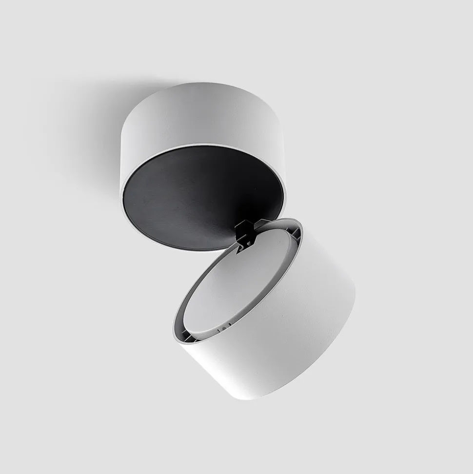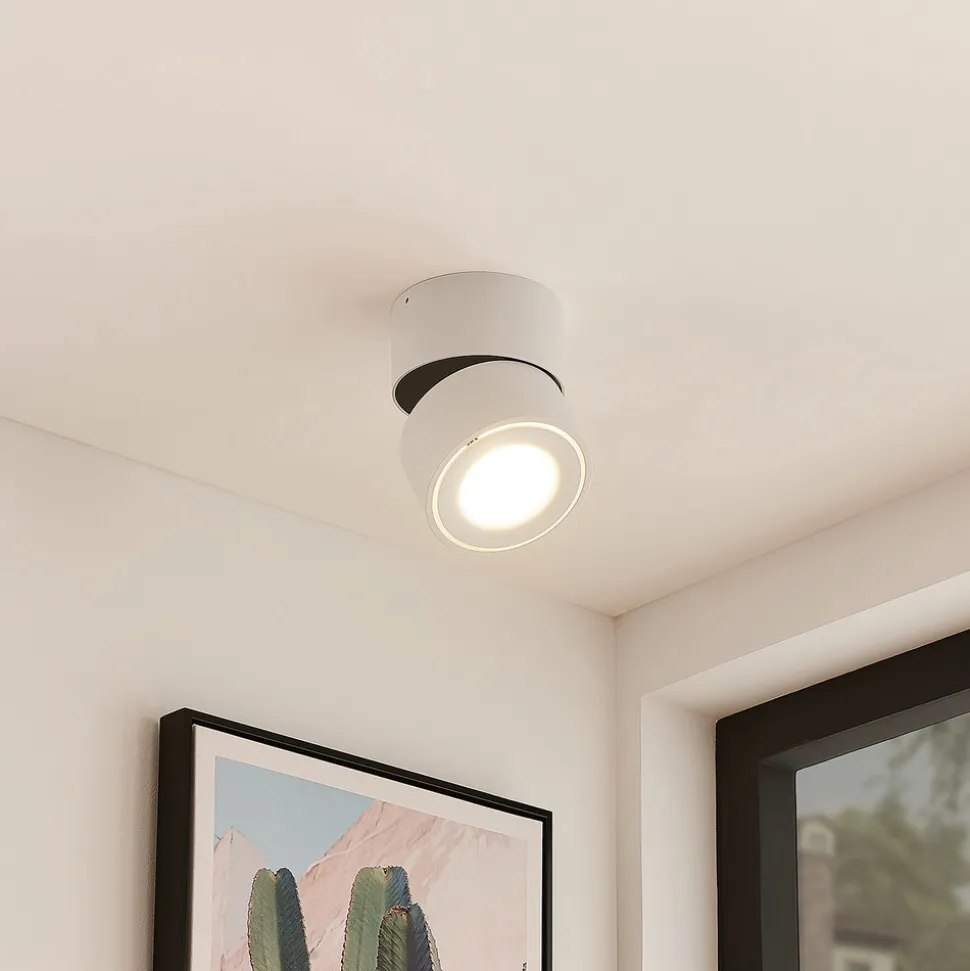 Roterende og svingbar Rotari LED-takspotlight i hvitt Den lille Rotari LED-takspotlighten imponerer med sitt moderne design og fleksible belysningsalternativer. Armaturhodet kan ikke bare dreies 350°, men også svinges 90°. Armaturhuset i aluminium er utstyrt med en innebygd reflektor som har en strålevinkel på 34° og beriker rommet med varmhvitt lys (3000 K). Armaturens lysstyrke kan ved behov justeres ved hjelp av en forkant- eller bakkantfasedimmer og har en CRI-verdi > 90. Driveren er integrert i armaturhuset.