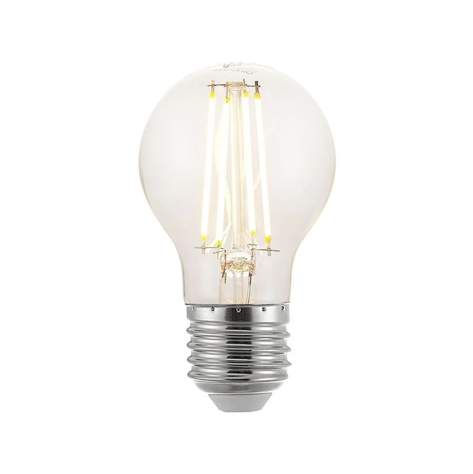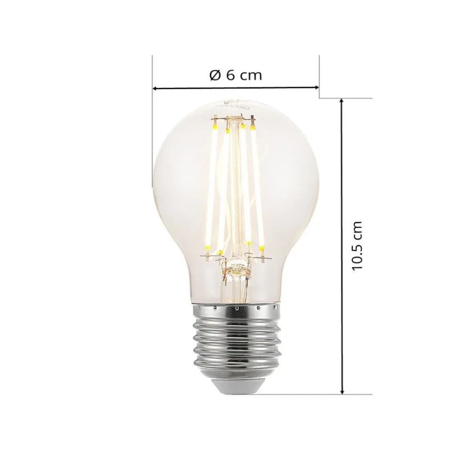 LED-lampe E27 filament klar, varmhvit, dimbar Denne klare LED-filamentpæren er en dekorativ erstatning for tradisjonelle glødepærer på 60 W i mange eksisterende armaturer. Lysstyrken på lampen kan stilles inn på tre nivåer (100 %, 55 %, 20 %) ved hjelp av veggbryteren uten behov for en ekstra dimmer.