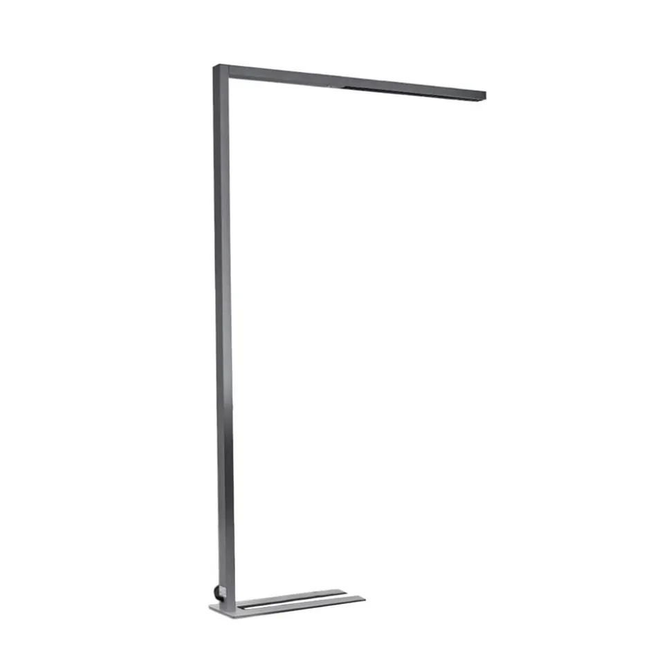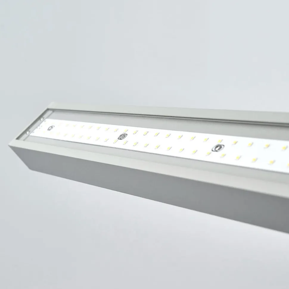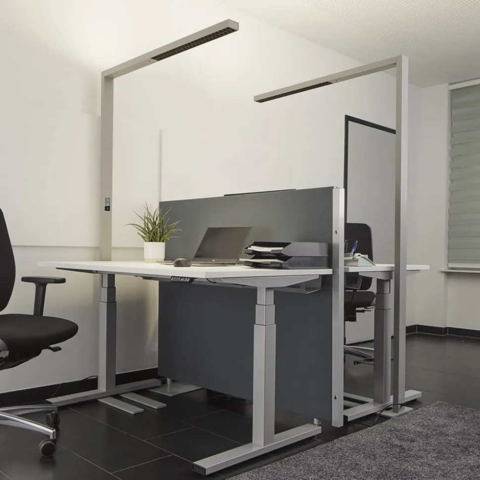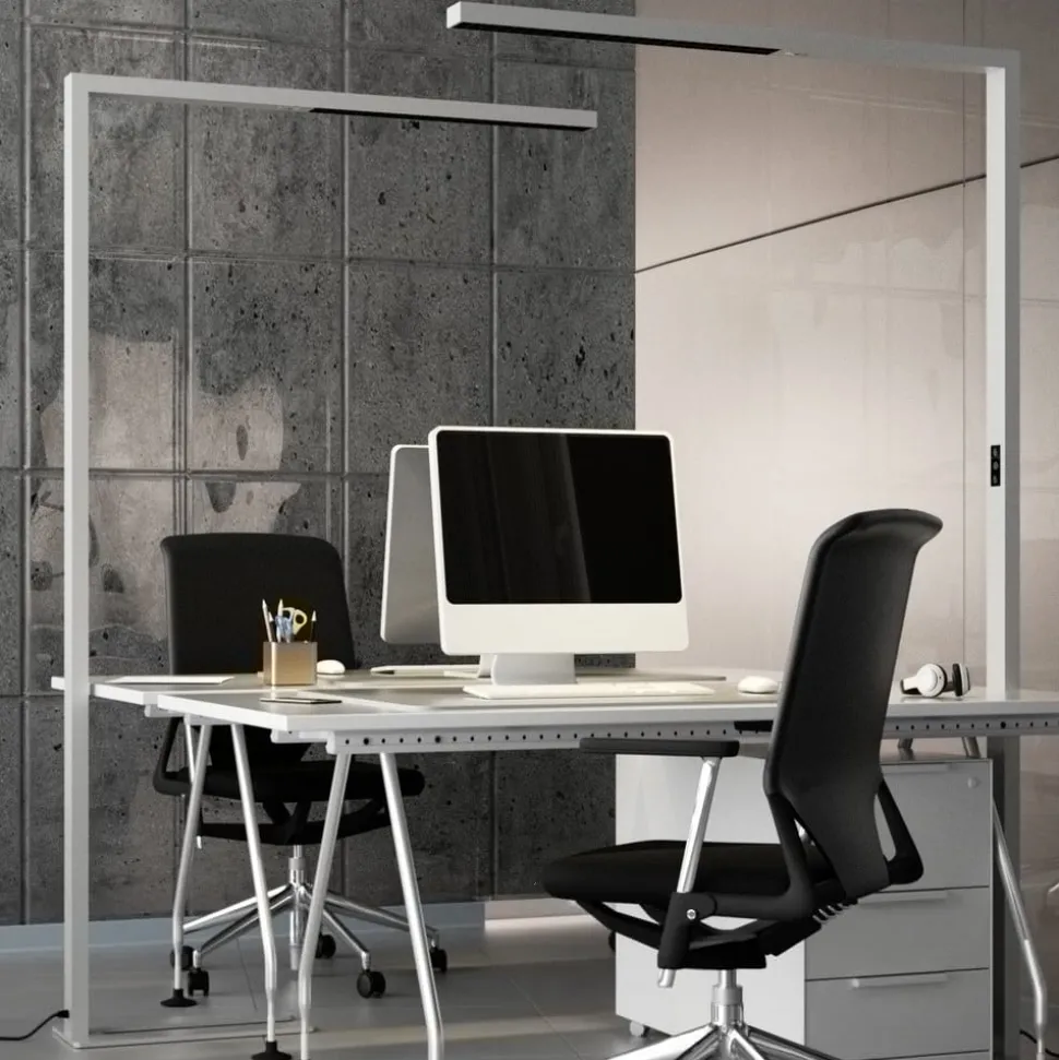 Funksjonell LED-gulvlampe til kontor Jolinda med dagslyssensor, bevegelsessensor, dimmer og direkte/indirekte belysning Jolinda har et minimalistisk og svært moderne utseende, da gulvlampen i utgangspunktet bare består av to smale stråler som er plassert vinkelrett på hverandre. Lyset skinner både oppover og nedover, nesten uten å blende nedover, noe som gir en svært behagelig lysopplevelse som er perfekt for lange perioder med konsentrert arbeid ved skrivebordet. LED-gulvlampen er egnet til å belyse et skrivebord, som da tilføres sterkt lys. Den høye funksjonaliteten bør også nevnes, da Jolinda ikke bare har en dimmefunksjon, men også styres via en dagslyssensor og en bevegelsessensor. Etter tretti minutters fravær slår armaturen seg av, og dagslyssensoren sørger for en relativt konstant lysstyrke i rommet fordi lyset fra LED-gulvlampen blir lysere eller mørkere avhengig av lysstyrken ute – med U-formet sokkel – UGR < 6 Armaturene er optimalisert for å gi en ideell, blendingsfri og jevn belysning for et standard skrivebord på 160 cm x 80 cm. Det anbefales derfor å bruke én lampe per skrivebord.