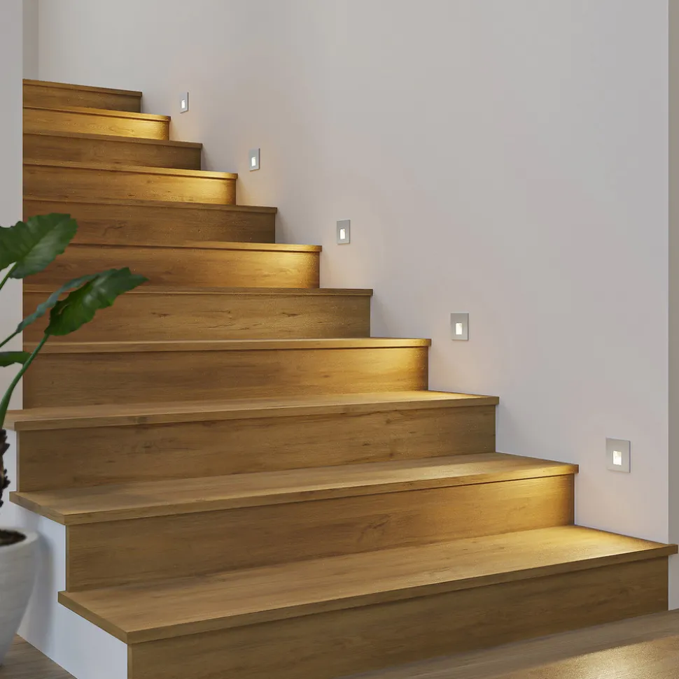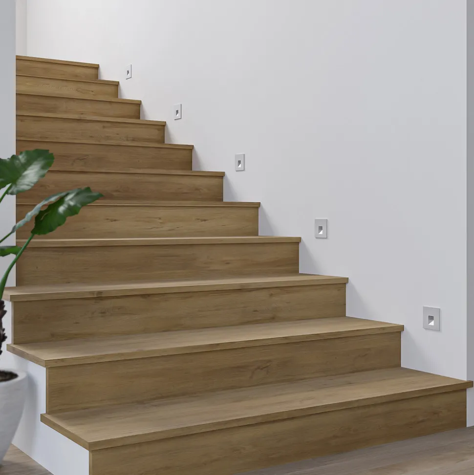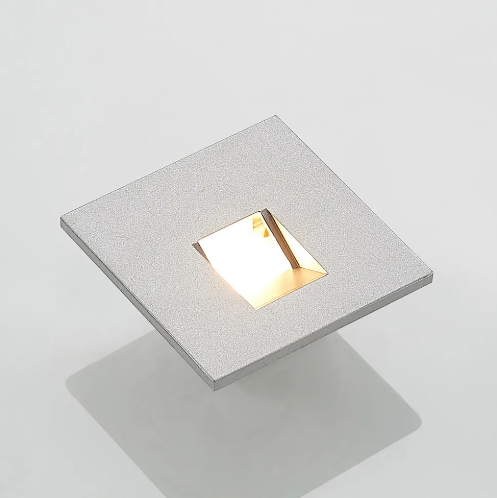 Kantet LED innfelt vegglampe Vexi i sølvfarget aluminium LED innfelt vegglampe Vexi gir pålitelig belysning i trapper eller korridorer, og forhindrer at man snubler i farlige situasjoner. Lampekroppen monteres i veggen og etterlater en slank, firkantet plate i midten, der de fastmonterte LED-lampene med god fargegjengivelse er plassert og spotlighter nedover for å forhindre blending. Lysdiodene kan stilles inn på en bestemt lysfarge (2 700 K, 3 000 K og 4 000 K) ved hjelp av en dip-bryter på baksiden, slik at de kan tilpasses personlige behov. Sølvfargen på Vexi LED innfelt vegglampe avrunder den enkle designen og integreres uanstrengt i mange ulike interiørstiler – CCT – gjennomgående kabling mulig