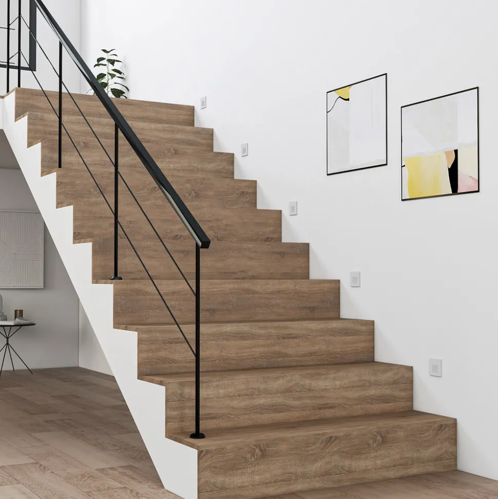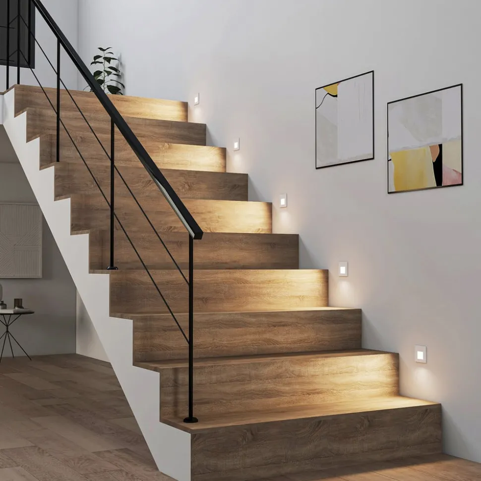 Hvit LED innfelt vegglampe Vexi av aluminium i kantet design LED innfelt vegglampe Vexi er den perfekte ledsageren for belysning av en trapp eller korridor. Lampekroppen er laget av aluminium og har en hvit overflate. Armaturen forsvinner nesten helt inn i veggen i hjemmet, og etterlater bare en slank plate på overflaten. Denne har en diffusor av plast og glass som omgir de fastmonterte LED-lampene og skaper blendingsfri belysning. I tillegg kan lysfargen på Vexi LED innfelt vegglampe justeres ved hjelp av en dip-bryter på baksiden (2 700 K, 3 000 K og 4 000 K) – Meget god fargegjengivelse – CCT – Mulighet for gjennomgående kabling