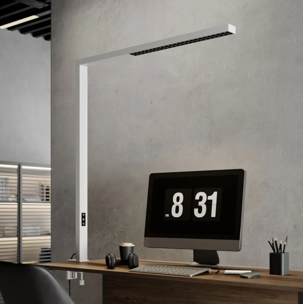 Hvit LED-klemmelampe Jolinda til kontorarbeidsplassen, blendfritt lys og berøringsdimmer, 4000 Kelvin Jolinda er en bordlampe som ikke holdes på plass av en fot, da den ser nesten akkurat ut som en LED-gulvlampe til kontor hvis man ikke ser nøye etter, men har en integrert klemmesokkel med en skrueklemme som gjør at den kan festes sikkert til kontorpulten, noe som gjør den til et innovativt belysningsobjekt for kontorlokaler. Spørsmålet om hvor man skal plassere armaturens sokkel hører definitivt fortiden til med denne designen, da det alltid skal være litt plass til å feste skrueklemmen. Dimmeren for nøyaktig justering av lysstyrken er plassert på armaturrammen i form av en berøringsplate, og lyset er svært sterkt i grunntilstanden, der størstedelen av lyset sendes indirekte oppover. Den direkte lyskomponenten minimerer blending og gir et universalhvitt lys av høyeste kvalitet og med en mest mulig naturlig effekt, noe som muliggjør effektivt og konsentrert arbeid uten at øynene blir for tidlig trette.