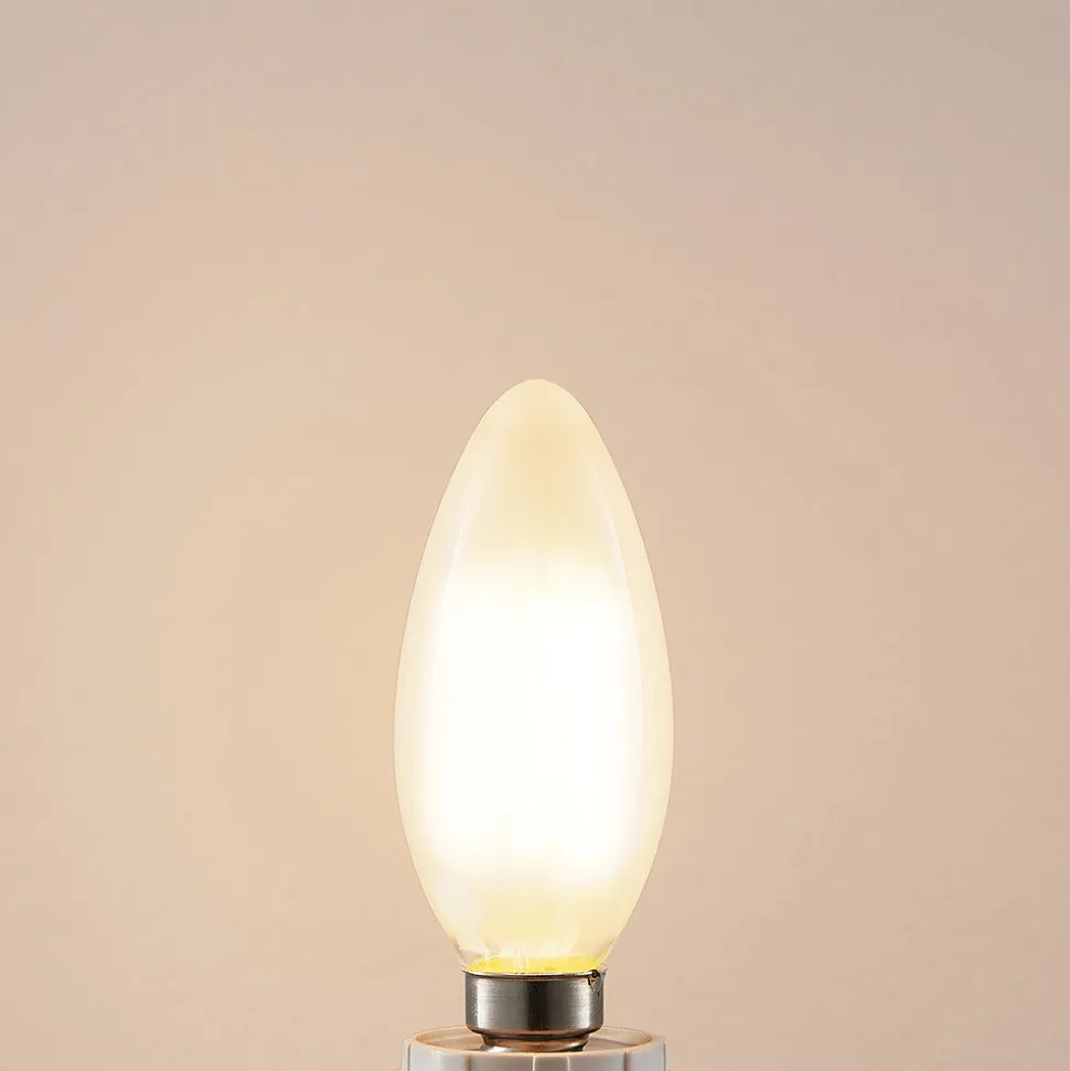 LED-mignonpære E14 4W, varmhvit (2700 K), dimbar, med frostet glass Denne LED-pæren gir god belysning som er blendingsfri takket være det frostede glasset. Effekten tilsvarer en tradisjonell glødepære på 40 W, selv om LED-teknologien er mer økonomisk når det gjelder forbruk. Lysstyrken på lampen kan justeres ved hjelp av en standard veggdimmer – Dimbar med faseavsnittdimmer
