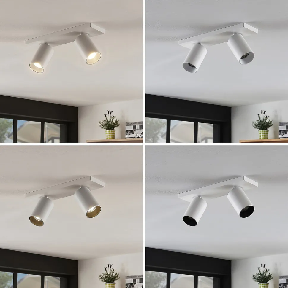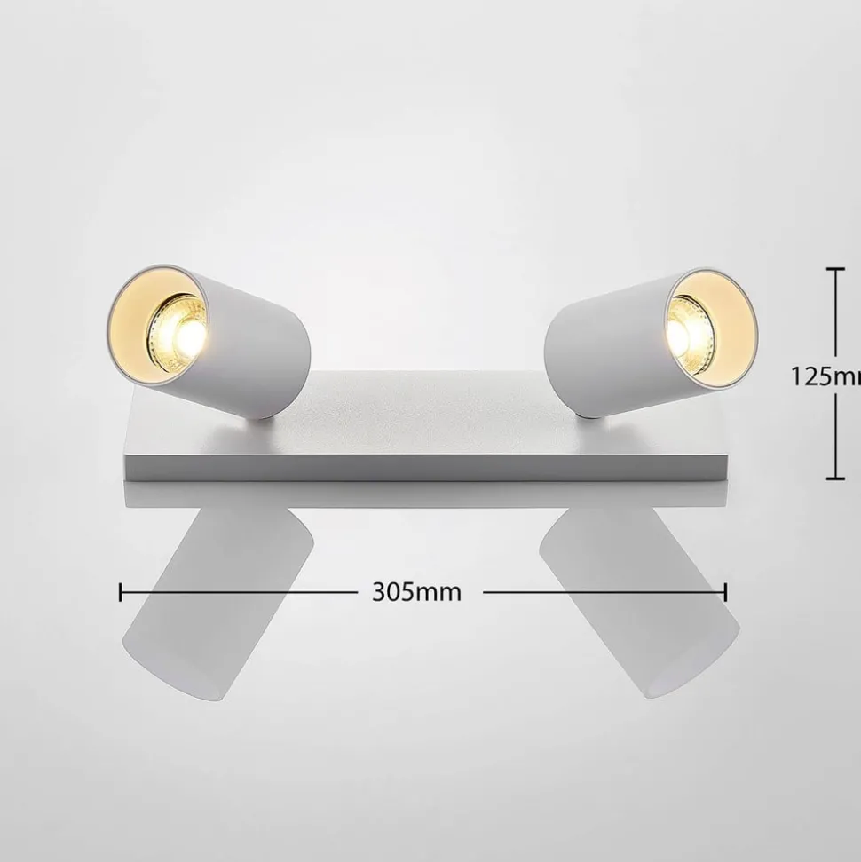 Den hvite lampen Brinja består av to sylinderformede spotlights som begge kan vippes 90 grader og dreies 350 grader rundt sin egen akse. Spotlights er festet til en rektangulær holder, slik at de kan monteres både på vegger og tak.