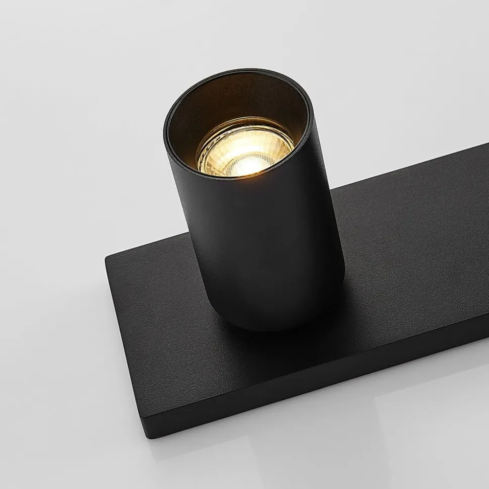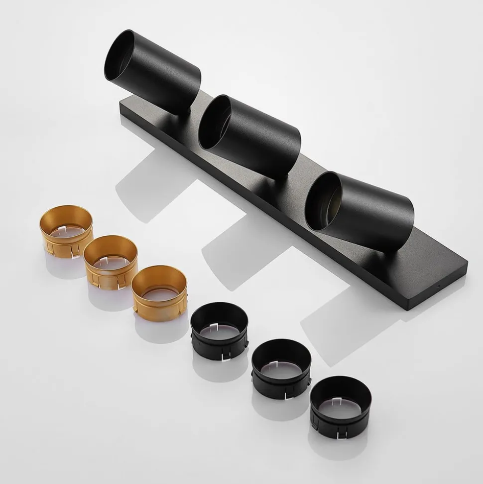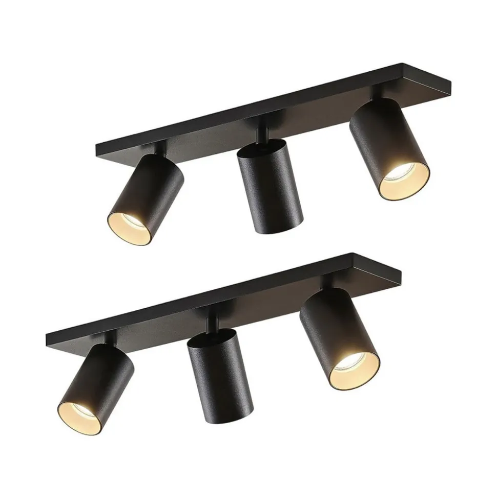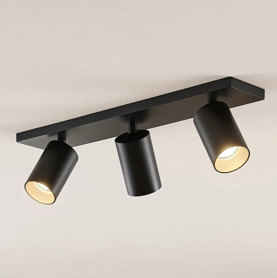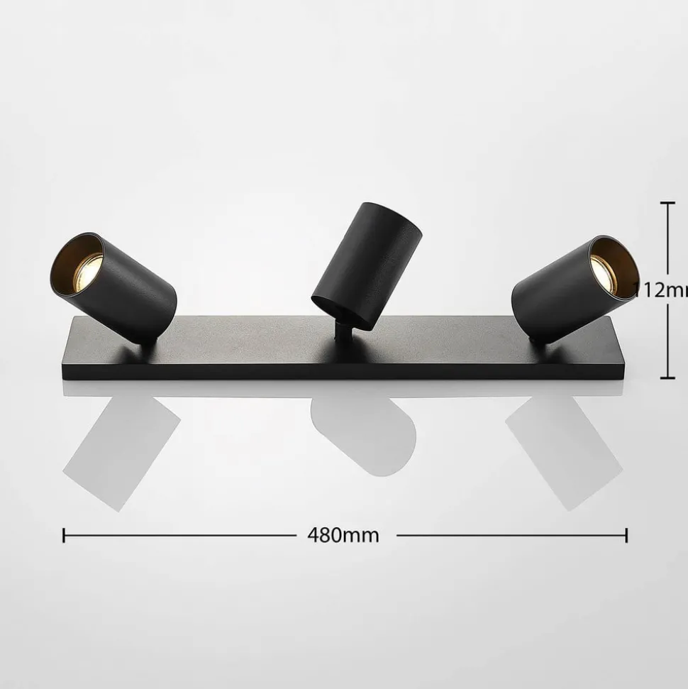 Svart spotlight Brinja i aluminium i 2-pakning Den svarte lampen Brinja i aluminium av høy kvalitet består av tre sylindriske spotlights som alle kan vippes 90 grader og roteres 350 grader. Spotlightene er montert på en rektangulær brakett som kan festes i taket eller på veggen. De tre kraftige spotlightene kan også brukes til å belyse store, vinklede rom på en optimal måte. Spotlightene kan justeres etter behov for å belyse ulike deler av rommet med sitt stemningsfulle lys. Brinja er tilgjengelig i en dobbeltpakke i dette tilbudet.